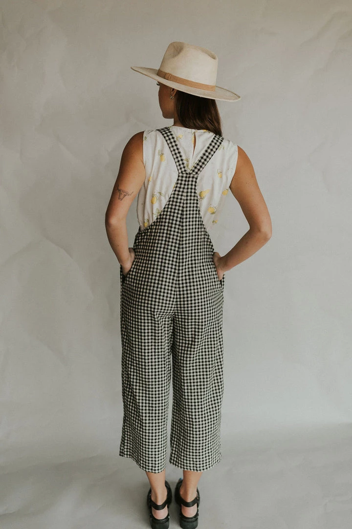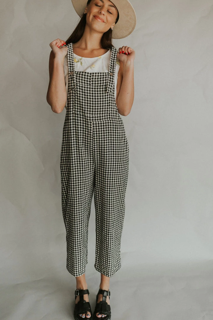 Gingham checkered overalls in black and ivory. Adjustable button straps. Nursing friendly! Large front pocket. Side pockets.