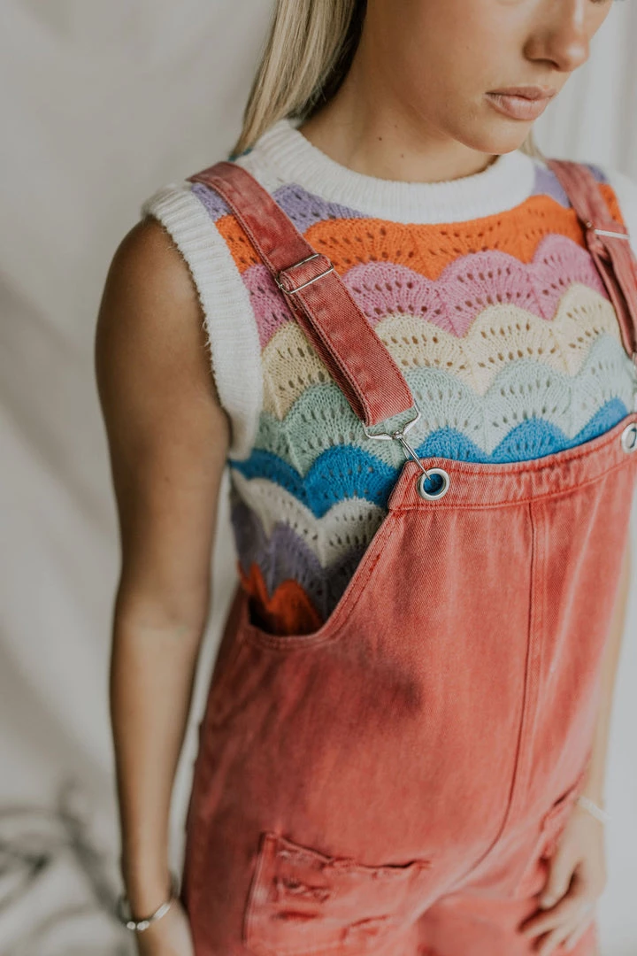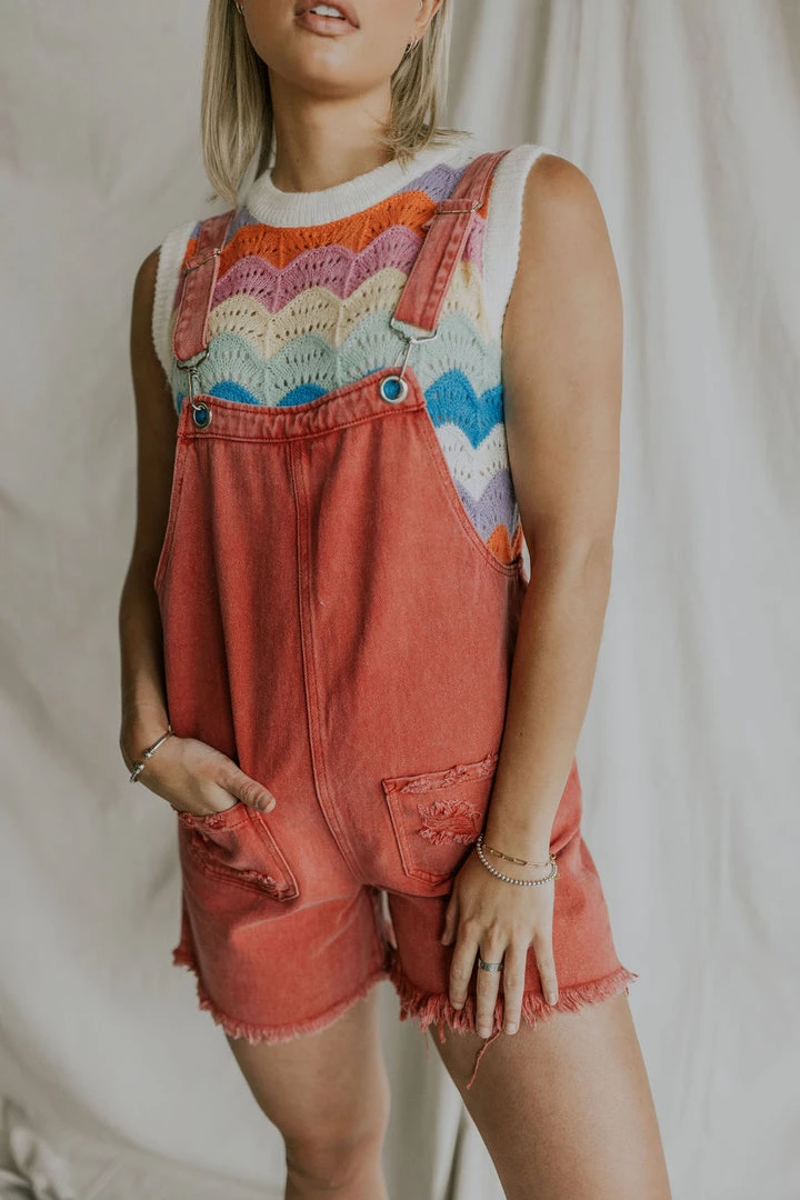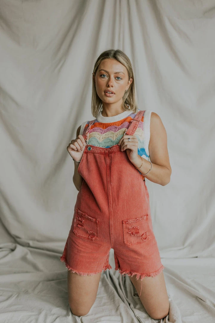 Soft denim jumper in candy apple red. Adjustable shoulder straps. Easy in and out. Pockets on front and back. Raw distressed hem detail.