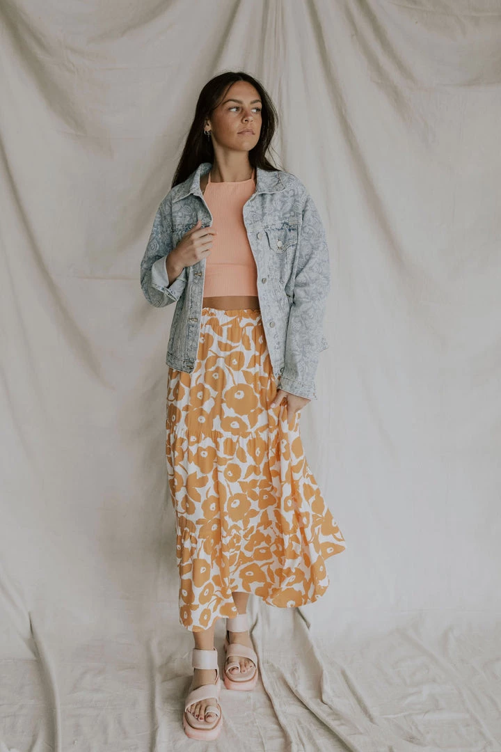 Floral tiered skirt in soft tangerine. Elastic waistband with ruffle detail. Skirt lined with side pockets. Â