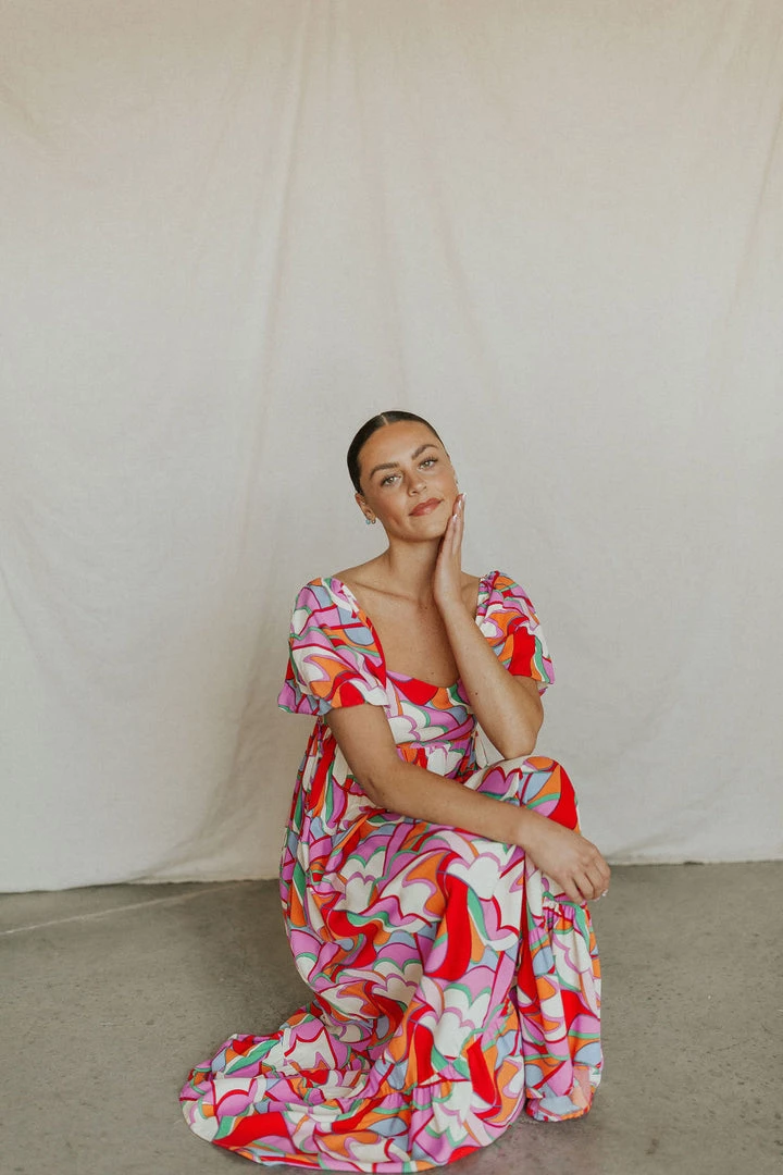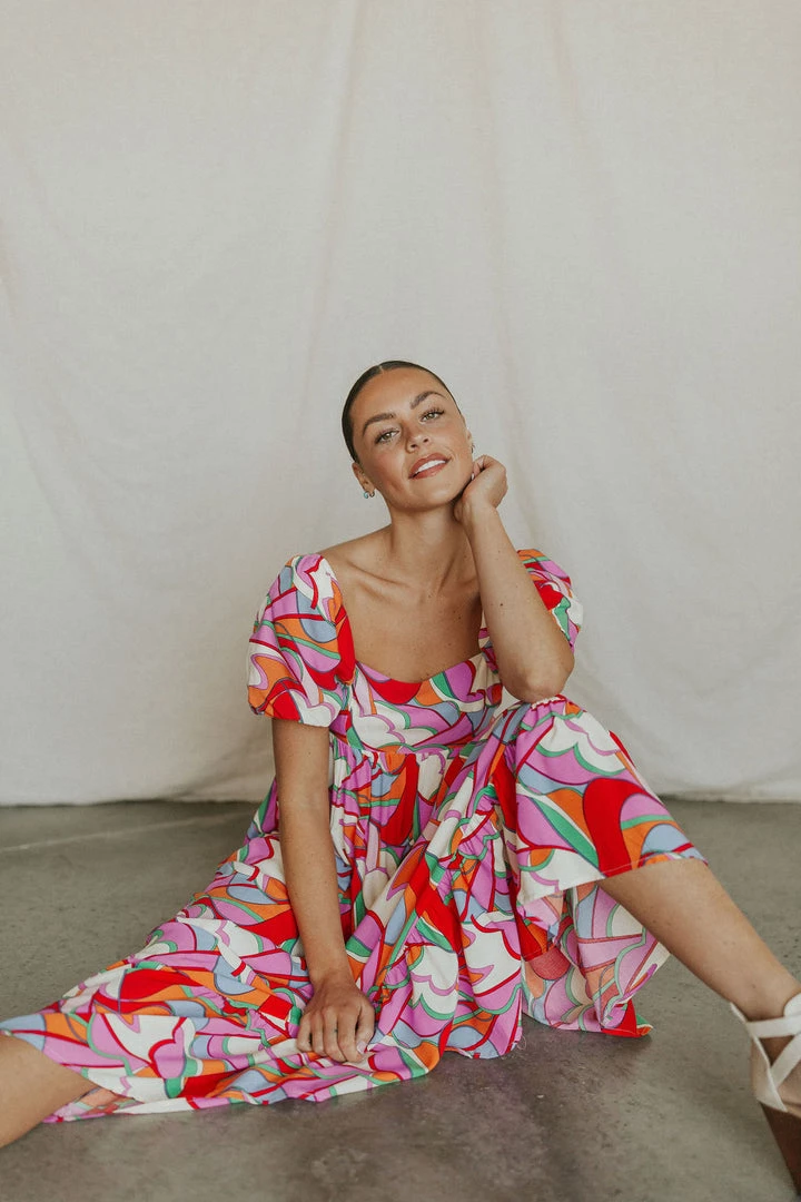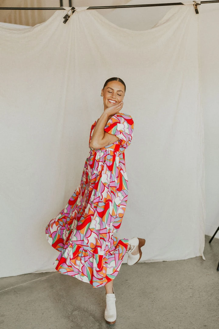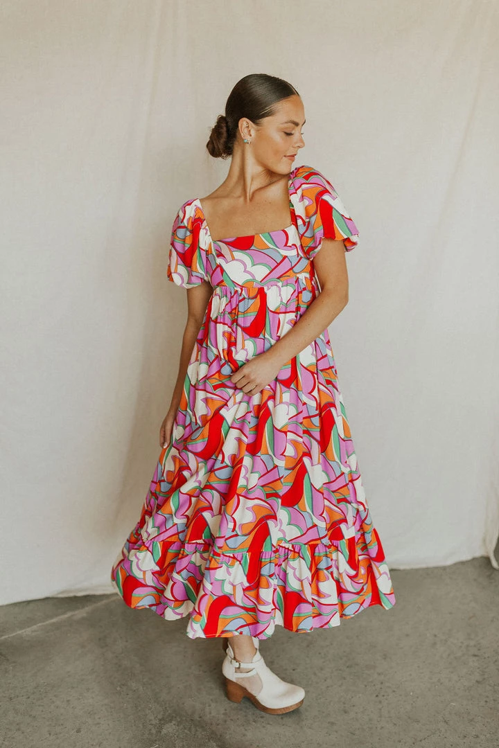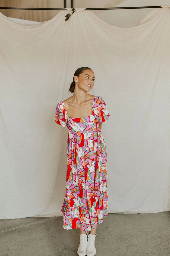 Abrstact print midi. Wide square neck. Elastic shoulders can be worn on or off the shoulder. Zipper back with smocking. Lined skirt with ruffle hem.