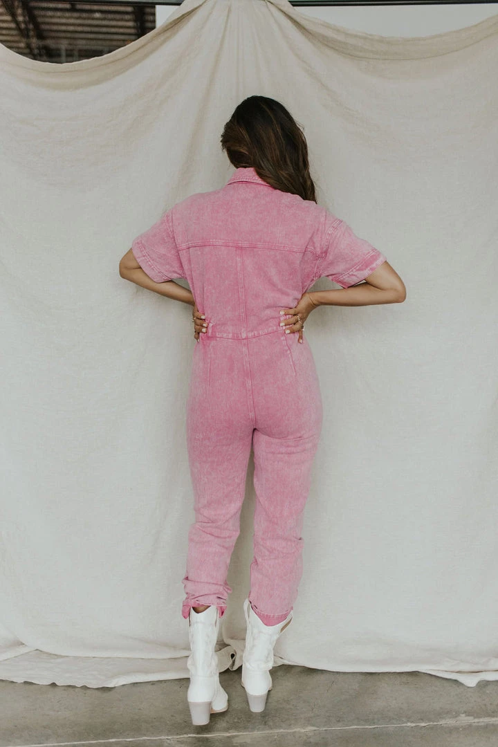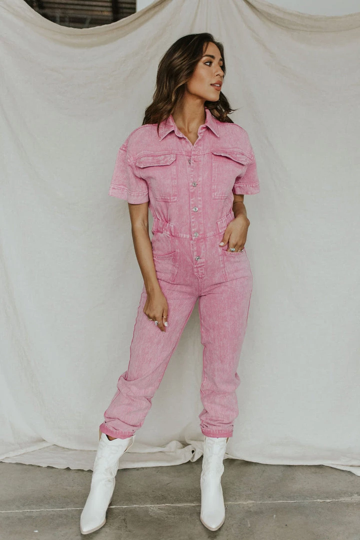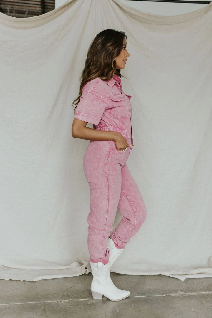 Soft denim jumpsuit. Acid wash pink. Button front with elastic waist sides. High waisted. Straight leg.