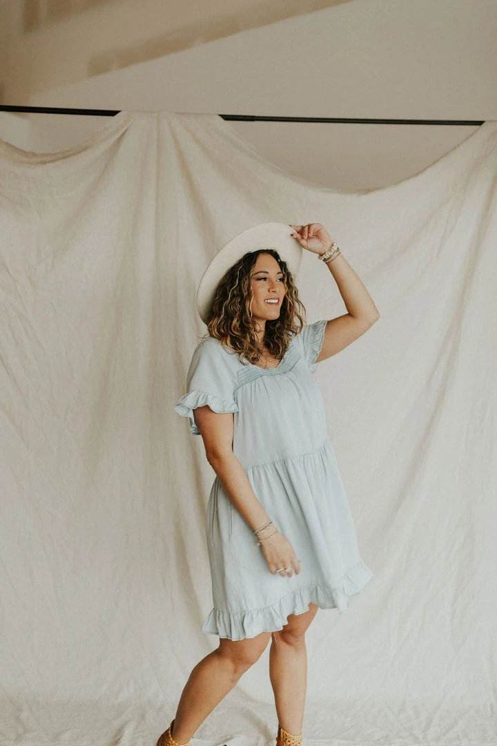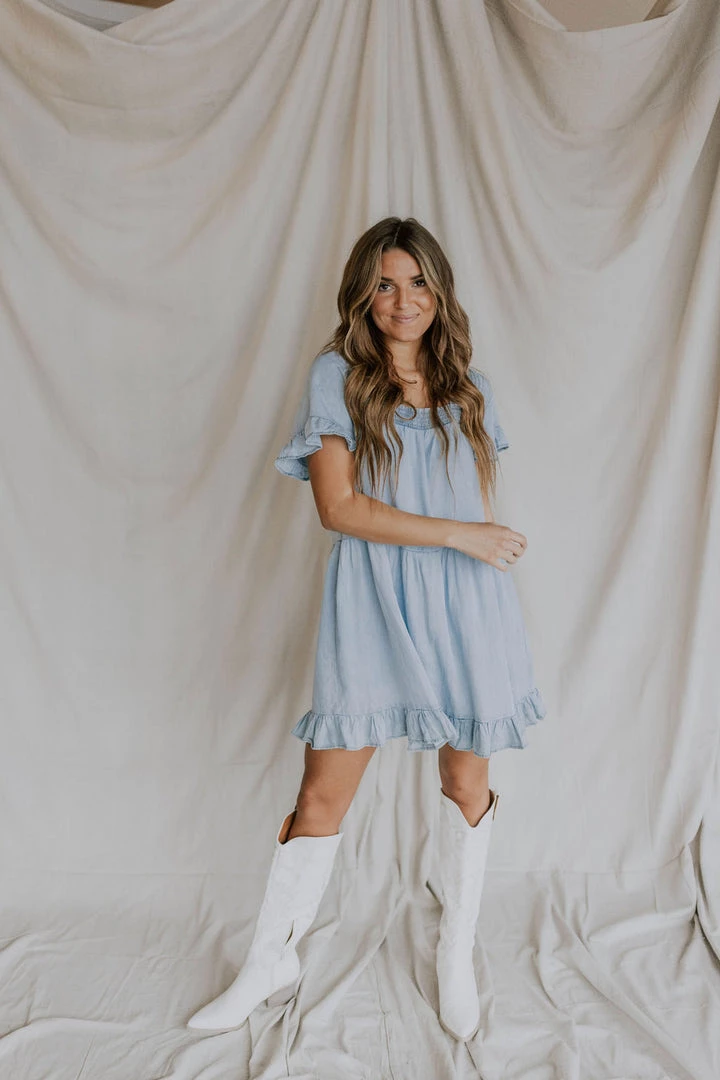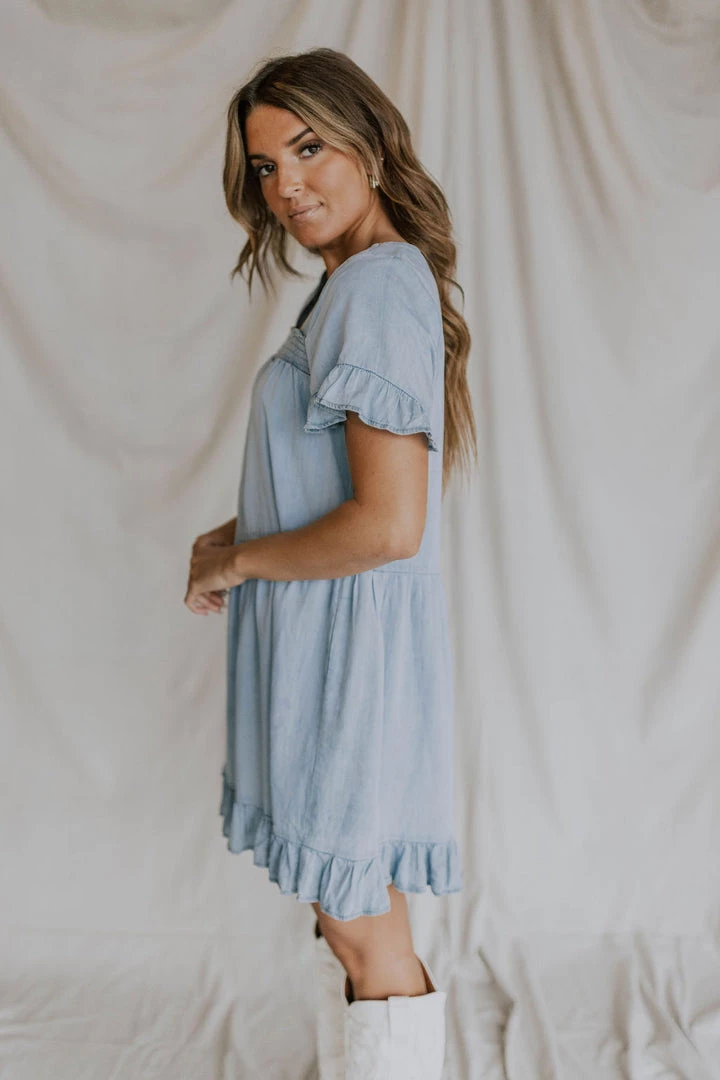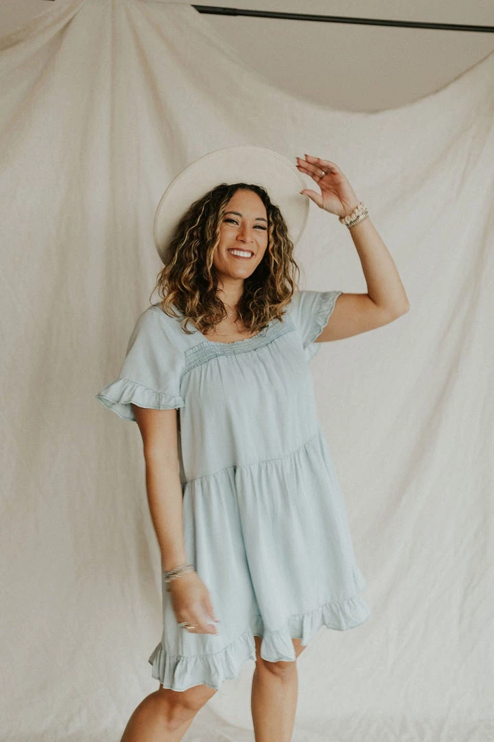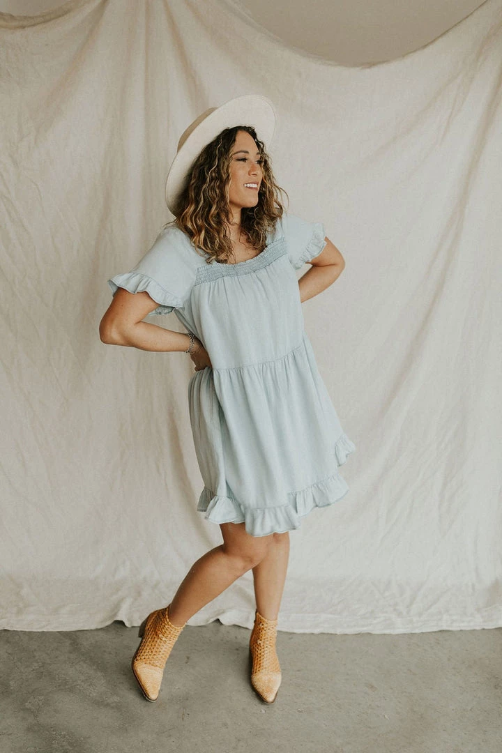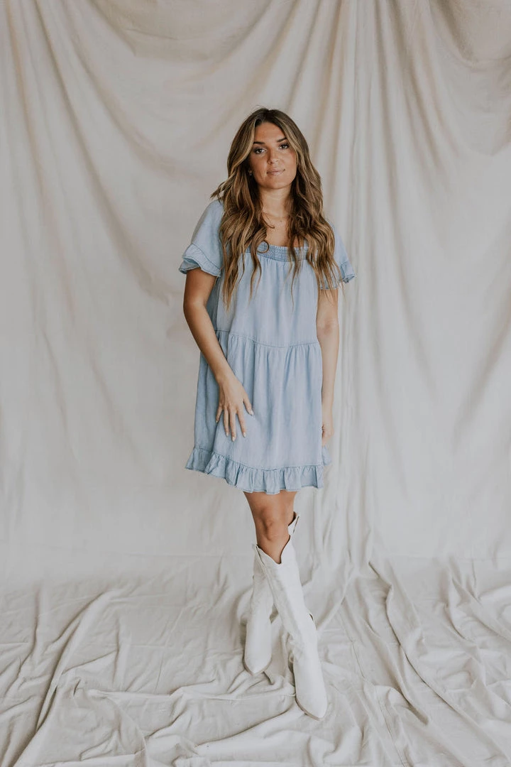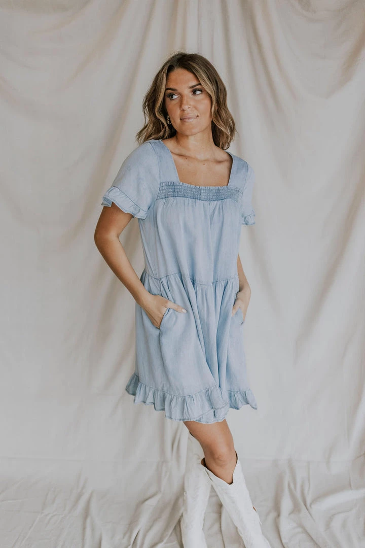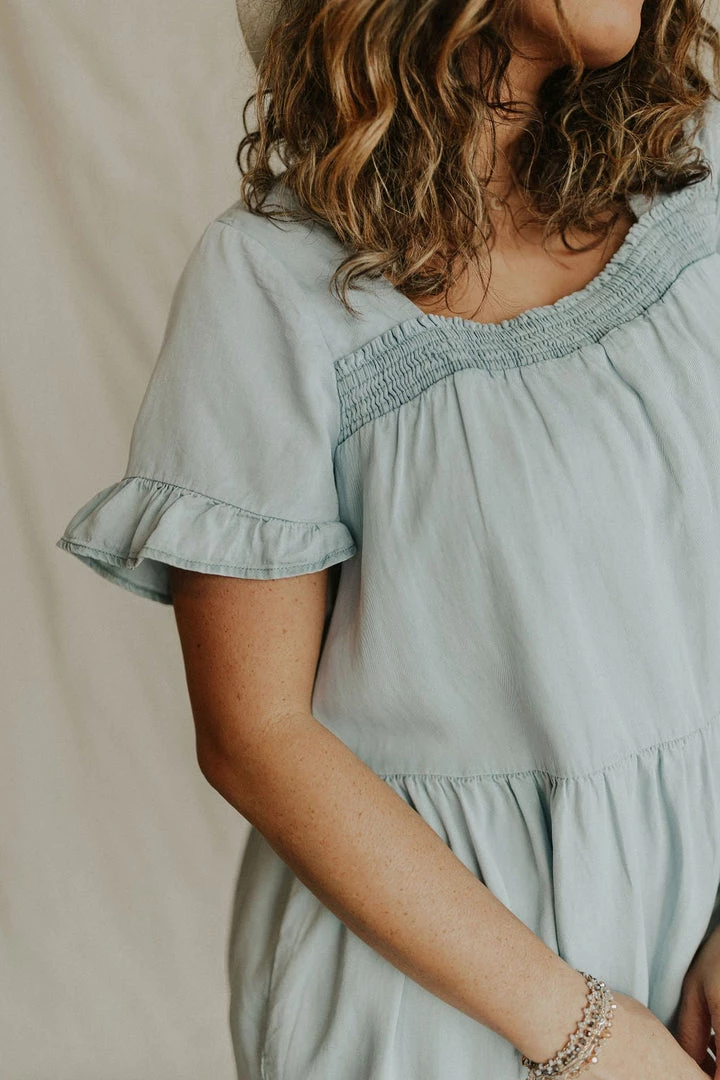 Tencel dress in denim blue. Smocked chest band with stretch. Ruffle detail on sleeves and skirt. Tiered skirt with side pockets.