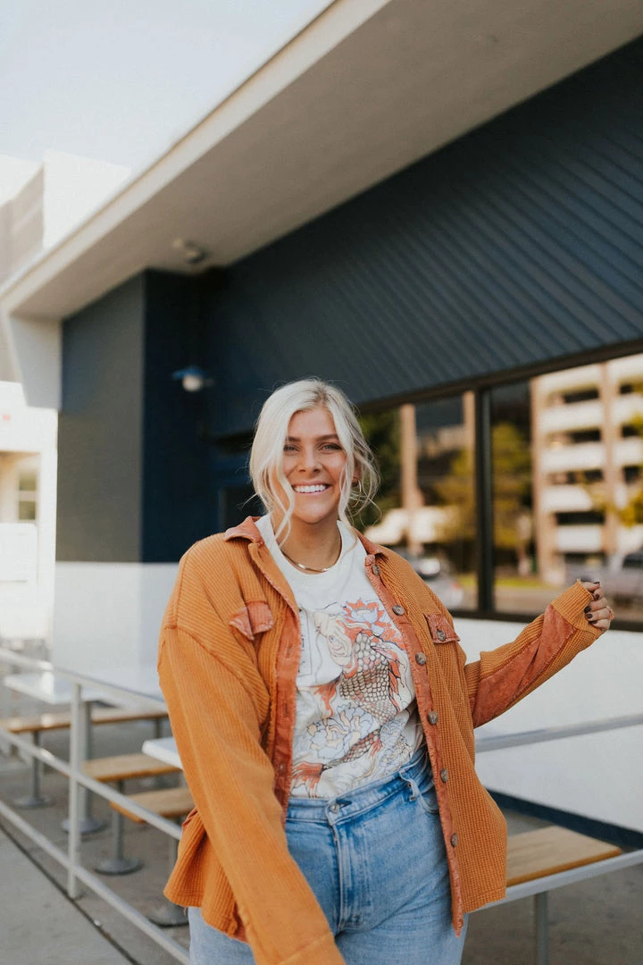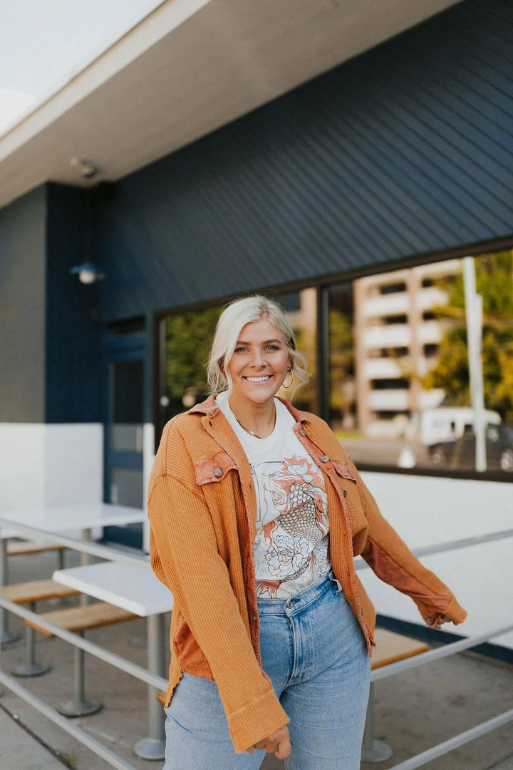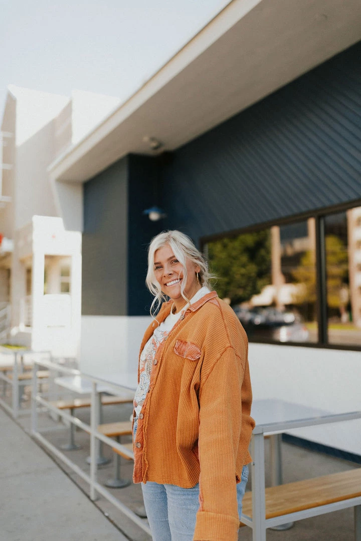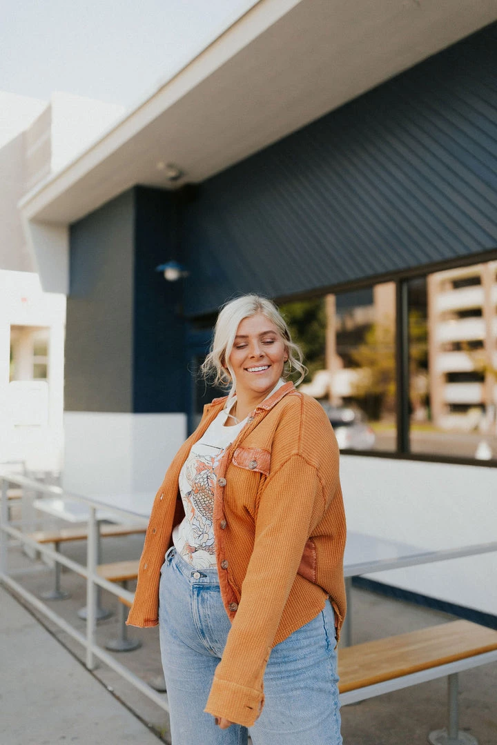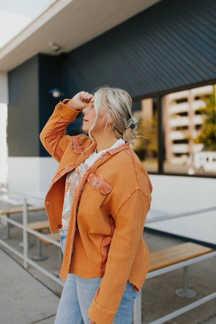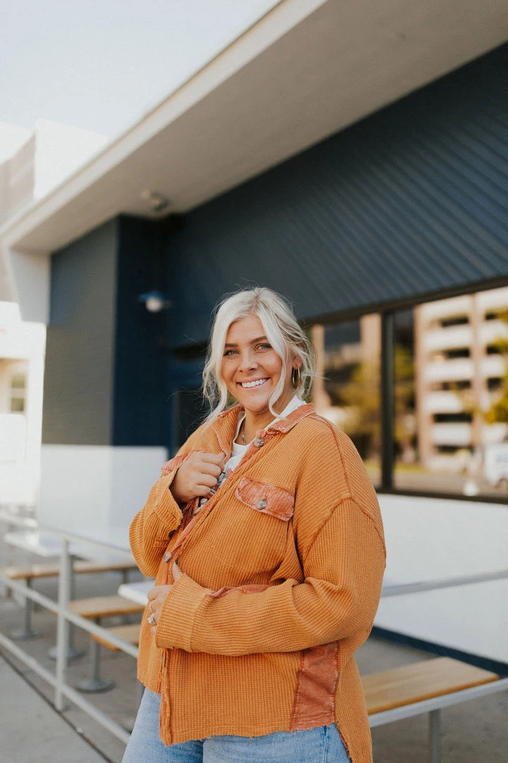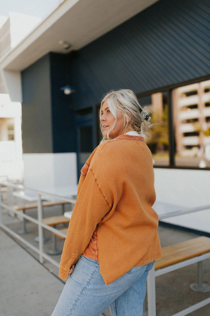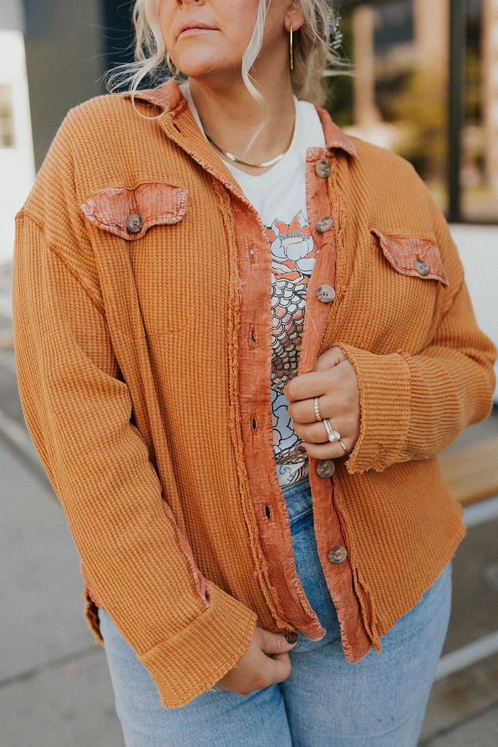 Washed waffle button up. Thermal fabric with lots of stretch. Contrasting fabric under arm. Available in multiple colors. Â