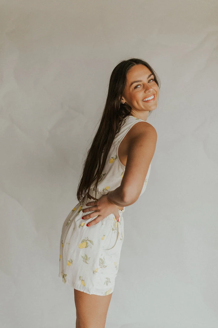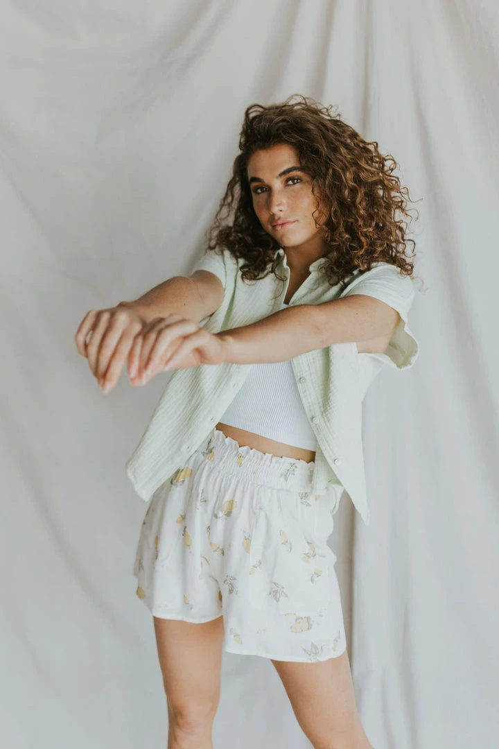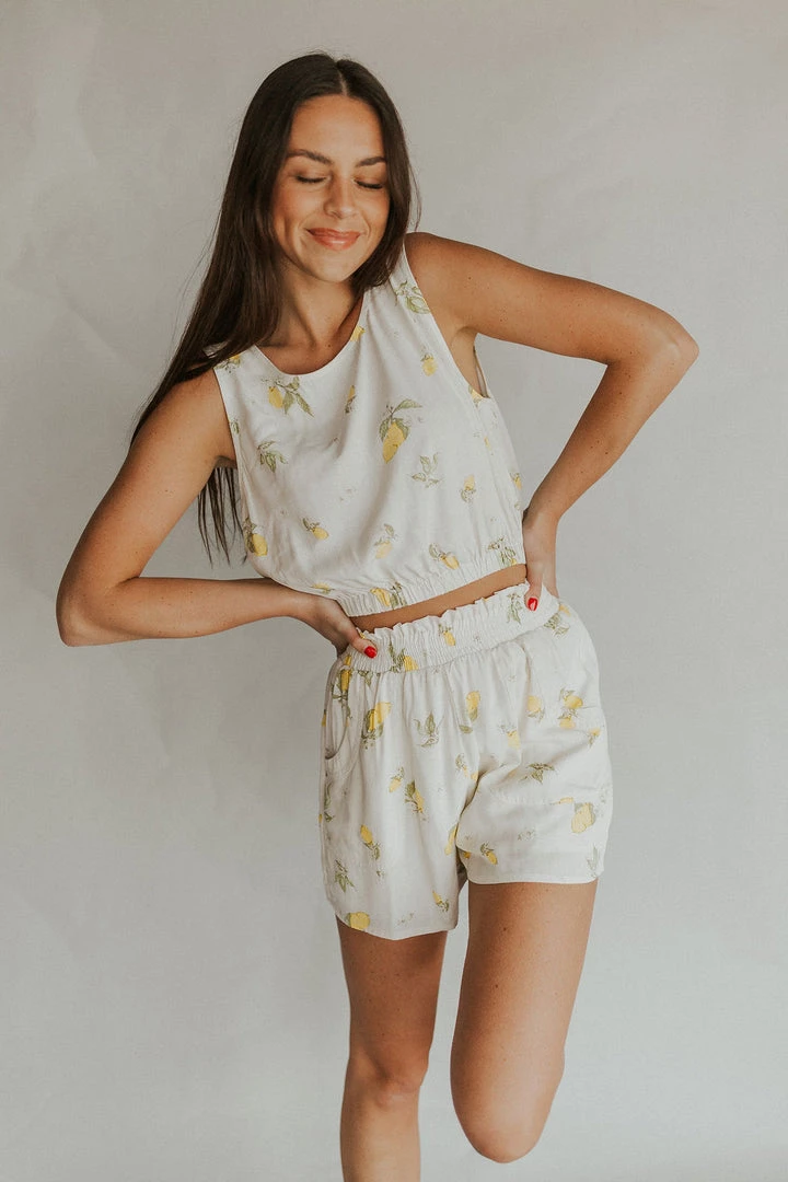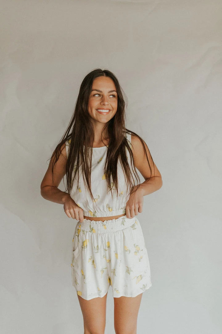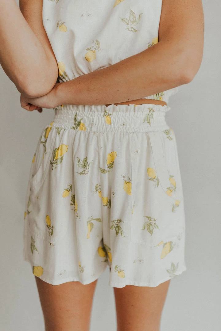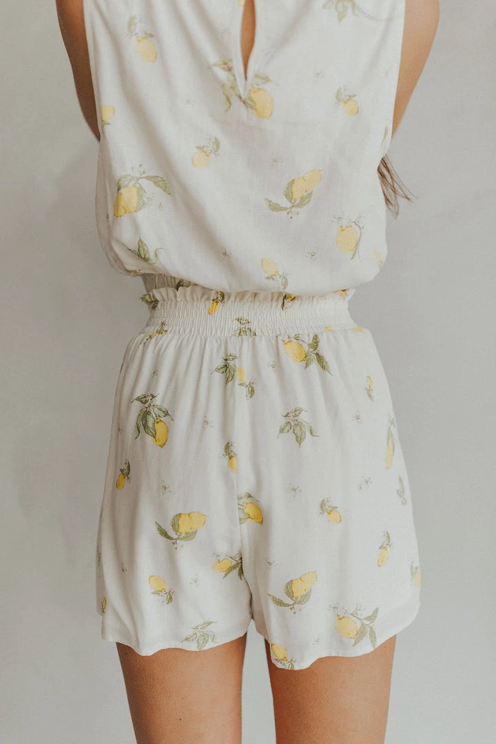 Lemon print shorts. Elastic waistband with pleated front. Front pockets.