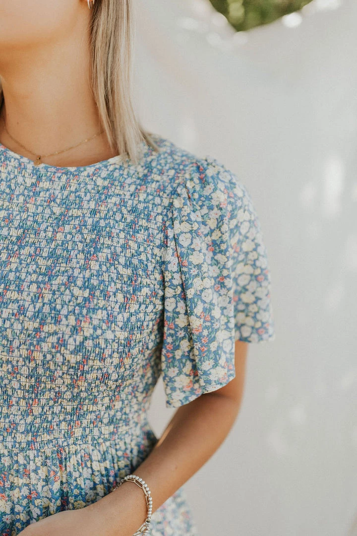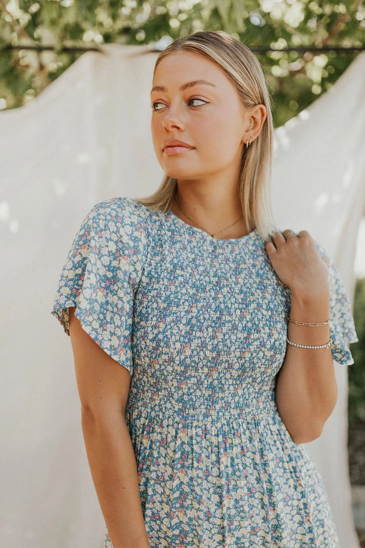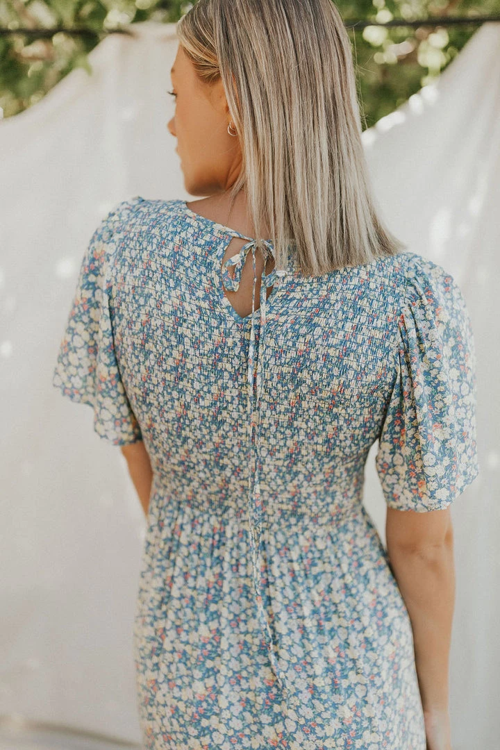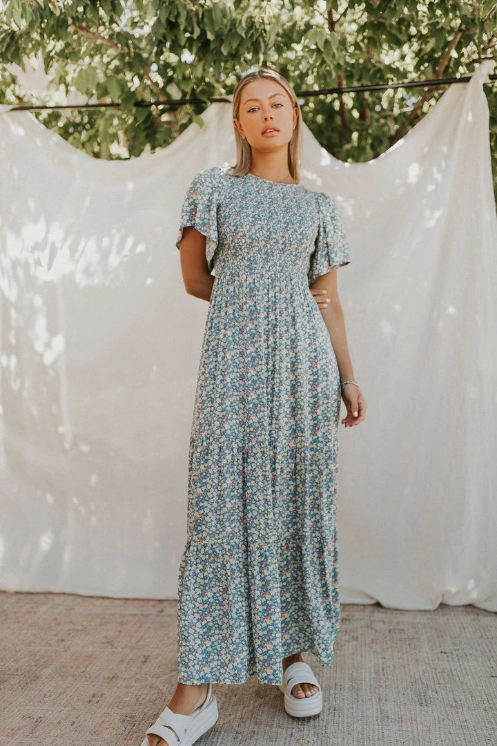 Smocked maxi. Flutter sleeves and tie closure in back. Tiered skirt. Available in multiple colors. Â