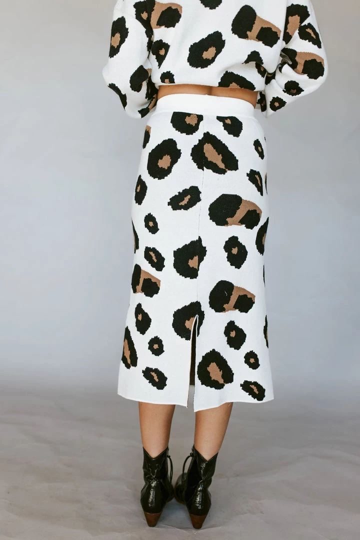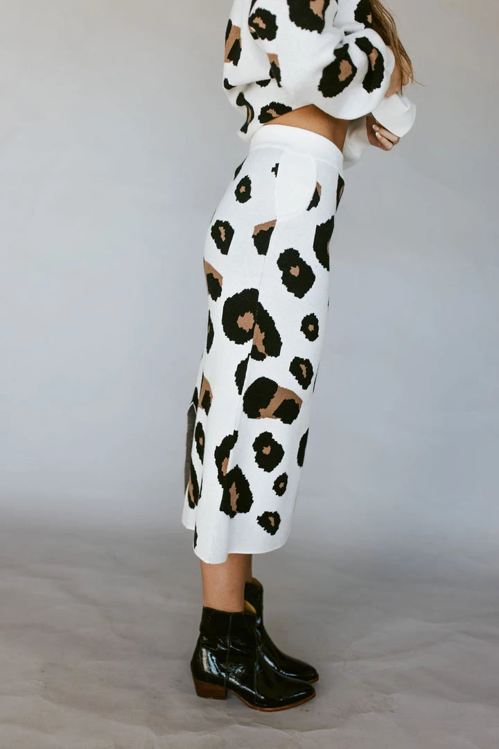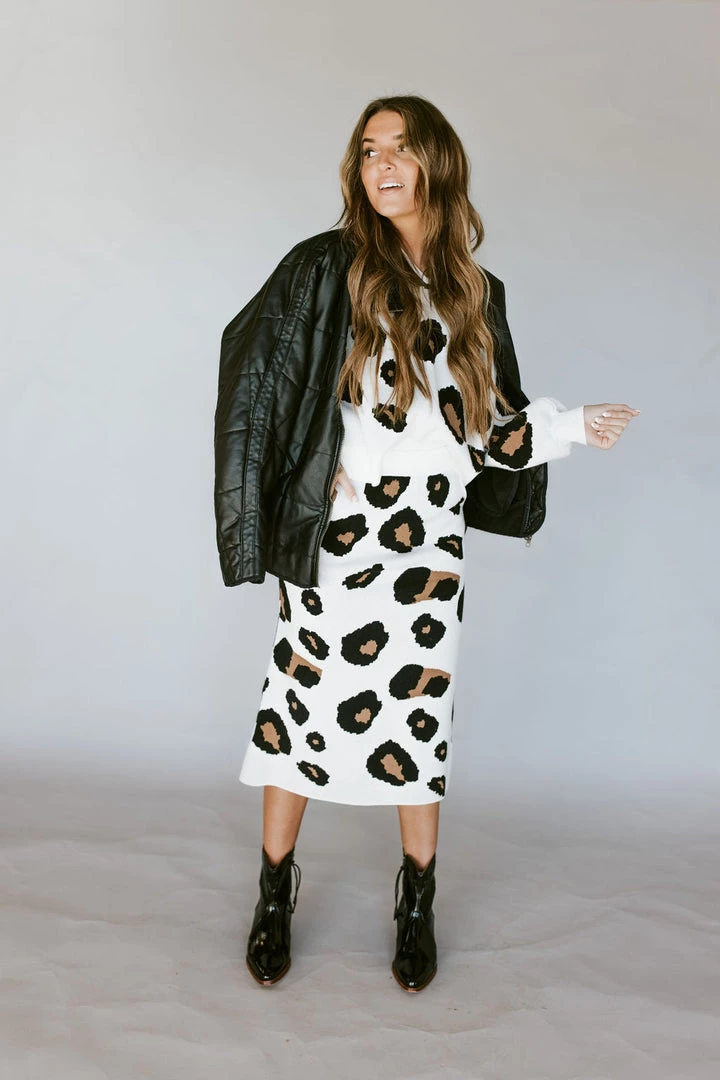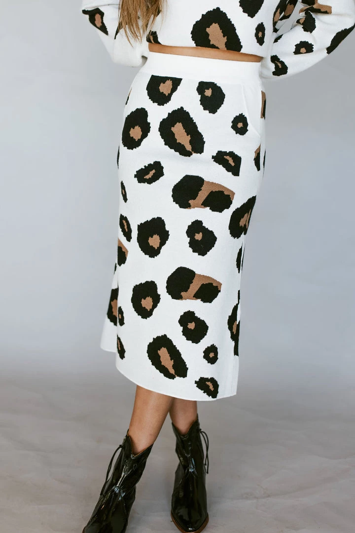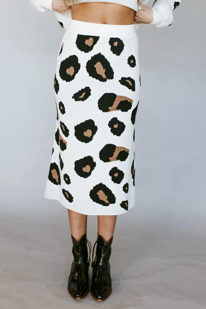Sweater skirt with leopard print. 10″ slit in back. Front pockets. Thick stretchy sturdy knit fabric. Pair perfectly with the Leo Leopard Sweater.