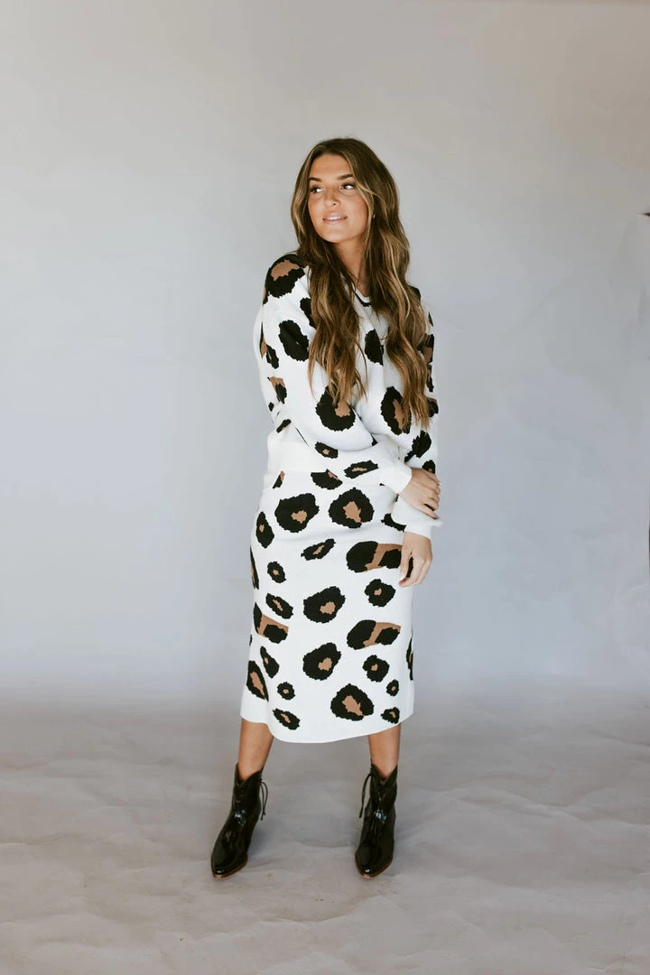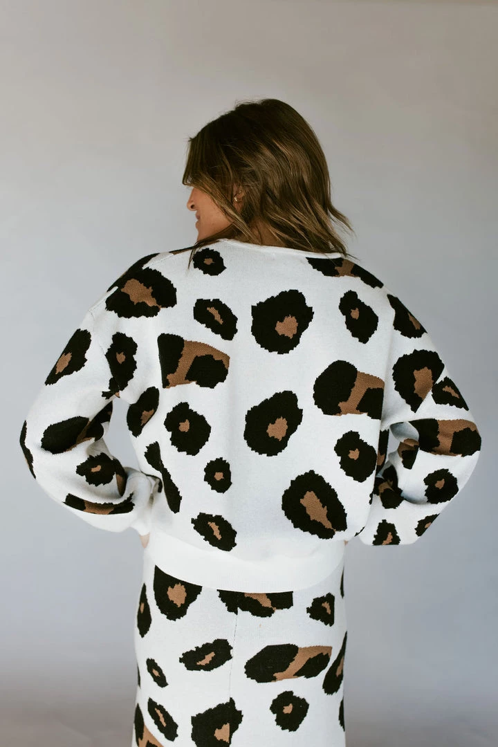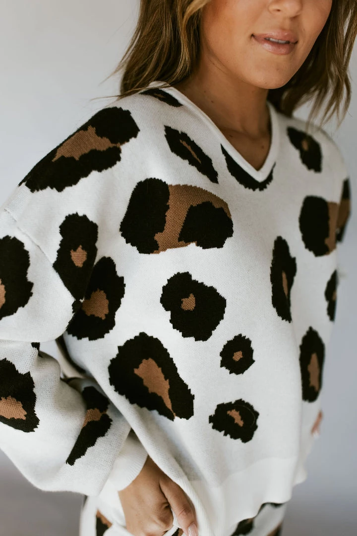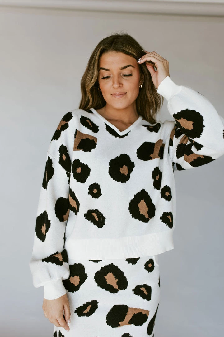 V-Neck sweater in leopard print. Soft washed feel. Thick stretchy sturdy knit fabric. Pair perfectly with the Leo Leopard Skirt.