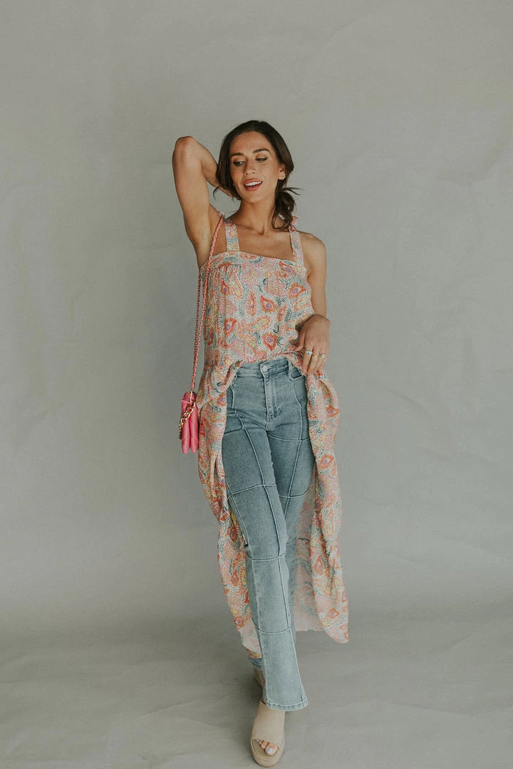 Paisley print maxi dress. Elastic back waistband. Self tie shoulder straps. Â