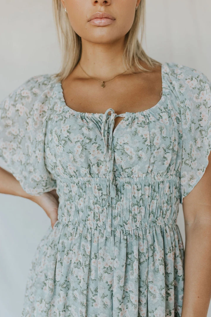 Sheer lined midi in light blue. Floral print. Flutter sleeves with elastic shoulders. Can be worn on or off the shoulder. Tie in front. Nursing friendly. Smocked waist with stretch. Tiered layered ruffle skirt.