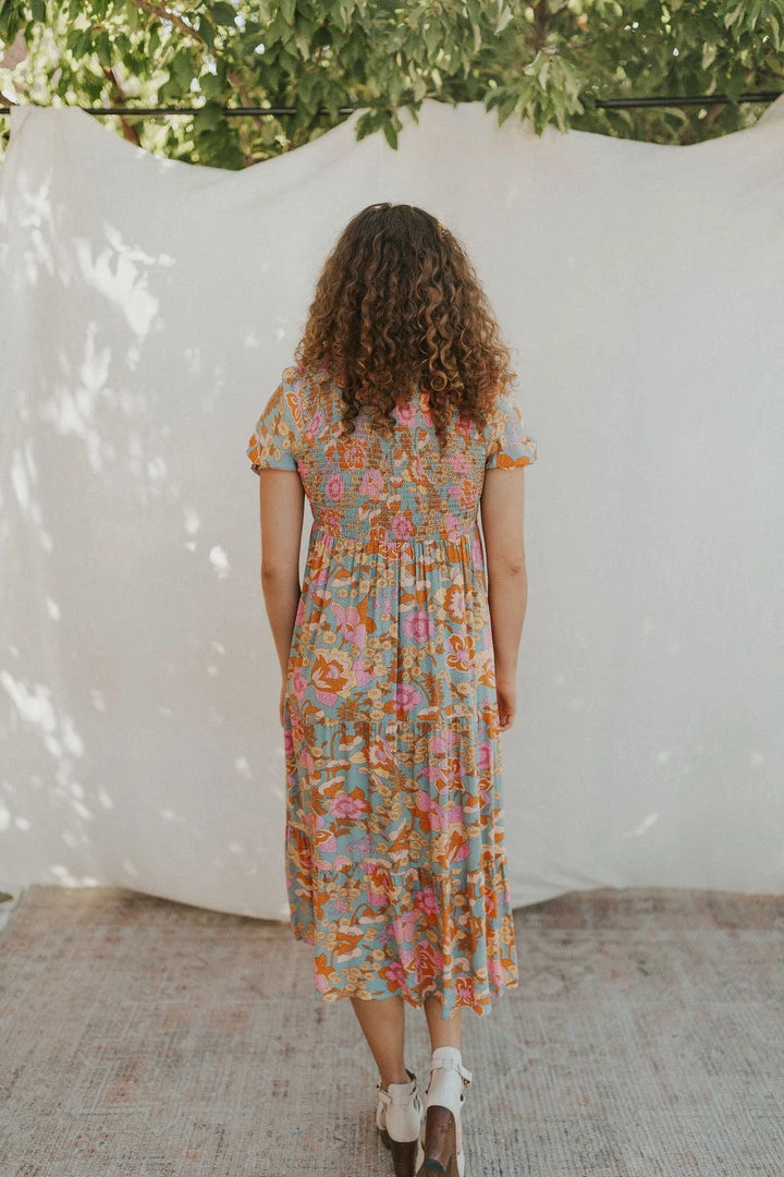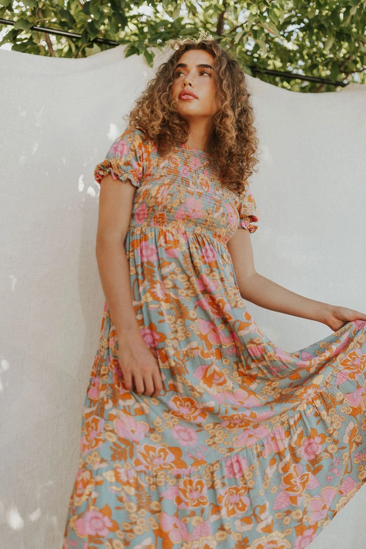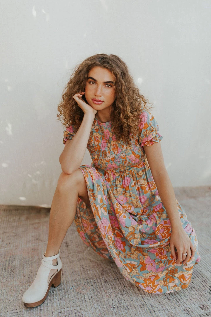 Smocked floral midi. Ruffle sleeves and tiered skirt. Skirt lined. Available in multiple colors.