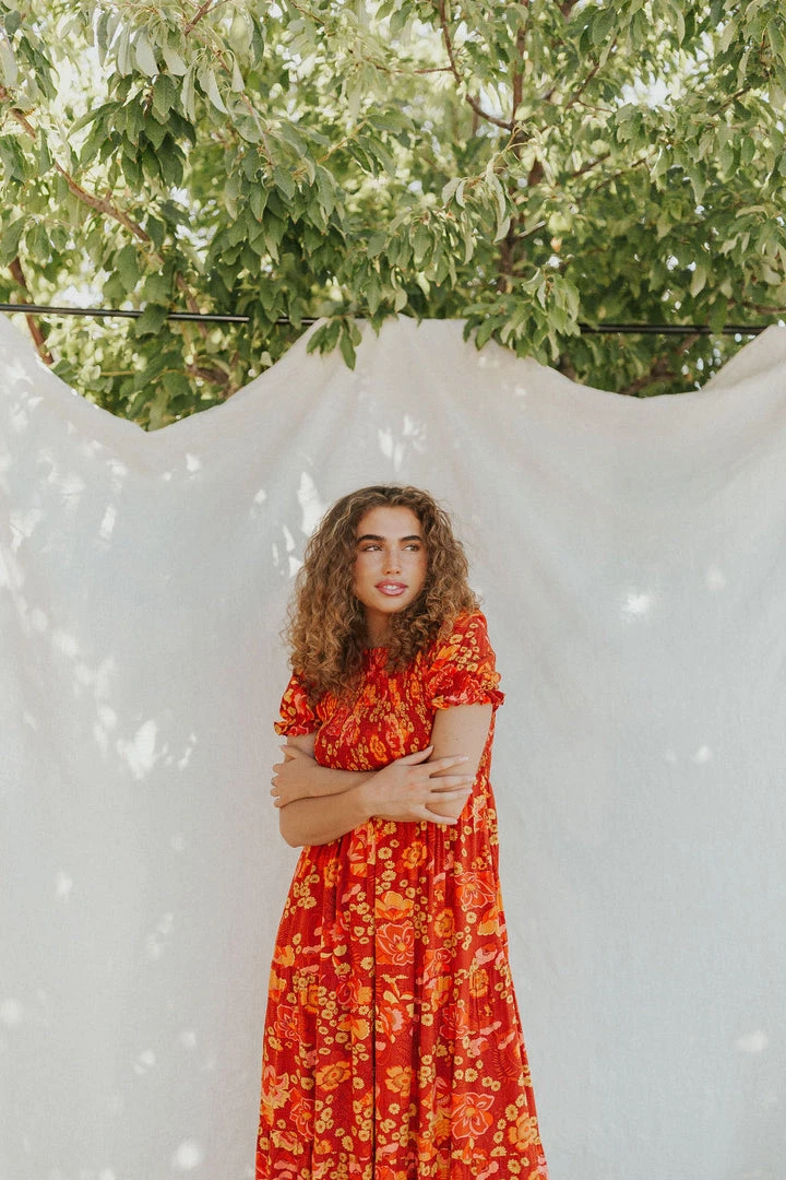 Smocked floral midi. Ruffle sleeves and tiered skirt. Skirt lined. Available in multiple colors.
