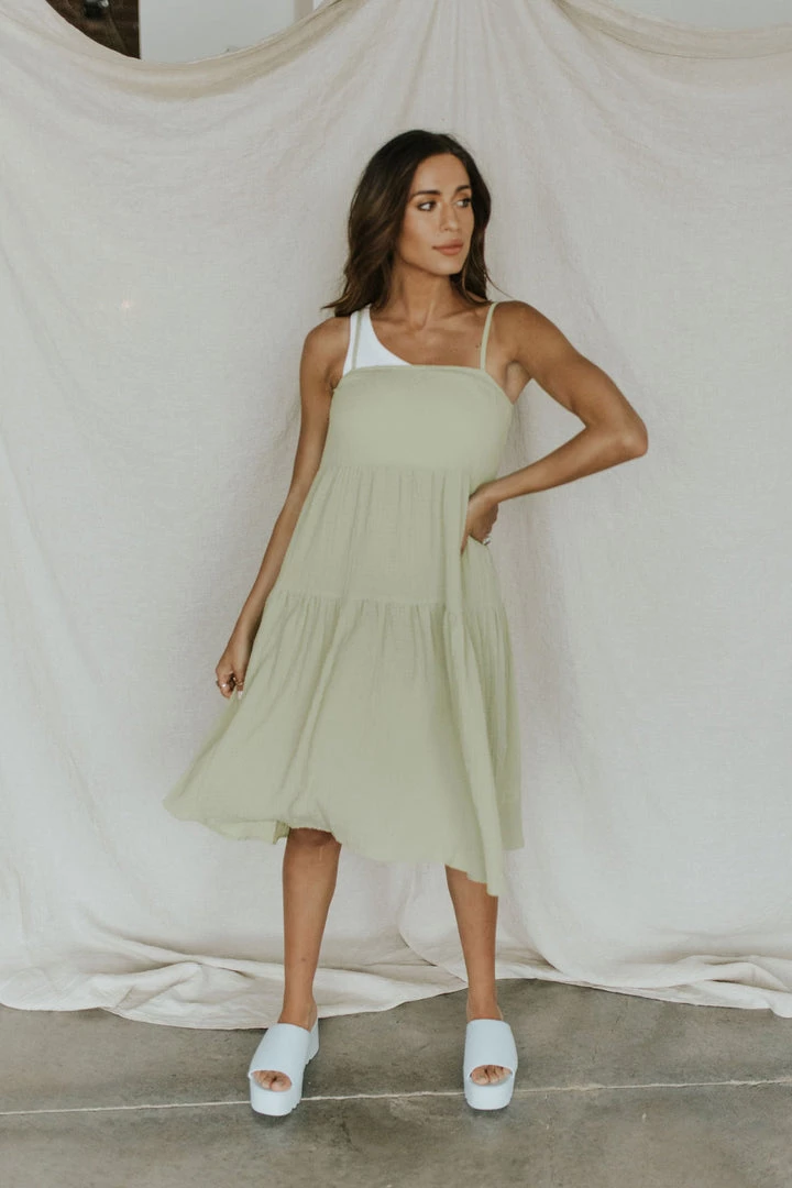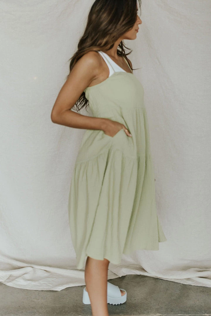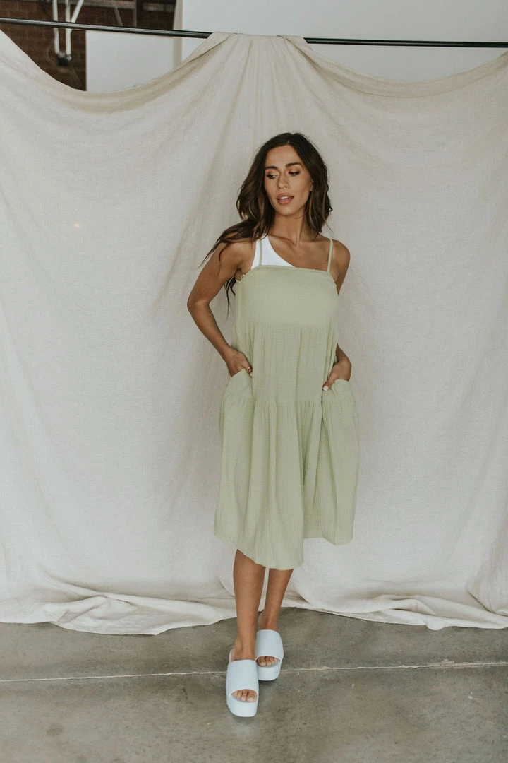 Textured gauze sundress in green. Tiered skirt with side pockets. Adjustable straps. No lining!
