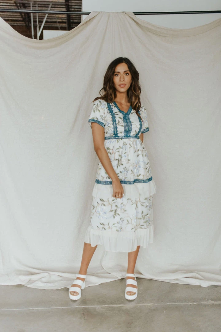 Full sheer midi with gem toned embroidery. Lace trim detail. Zipper back. Tiered ruffle skirt.