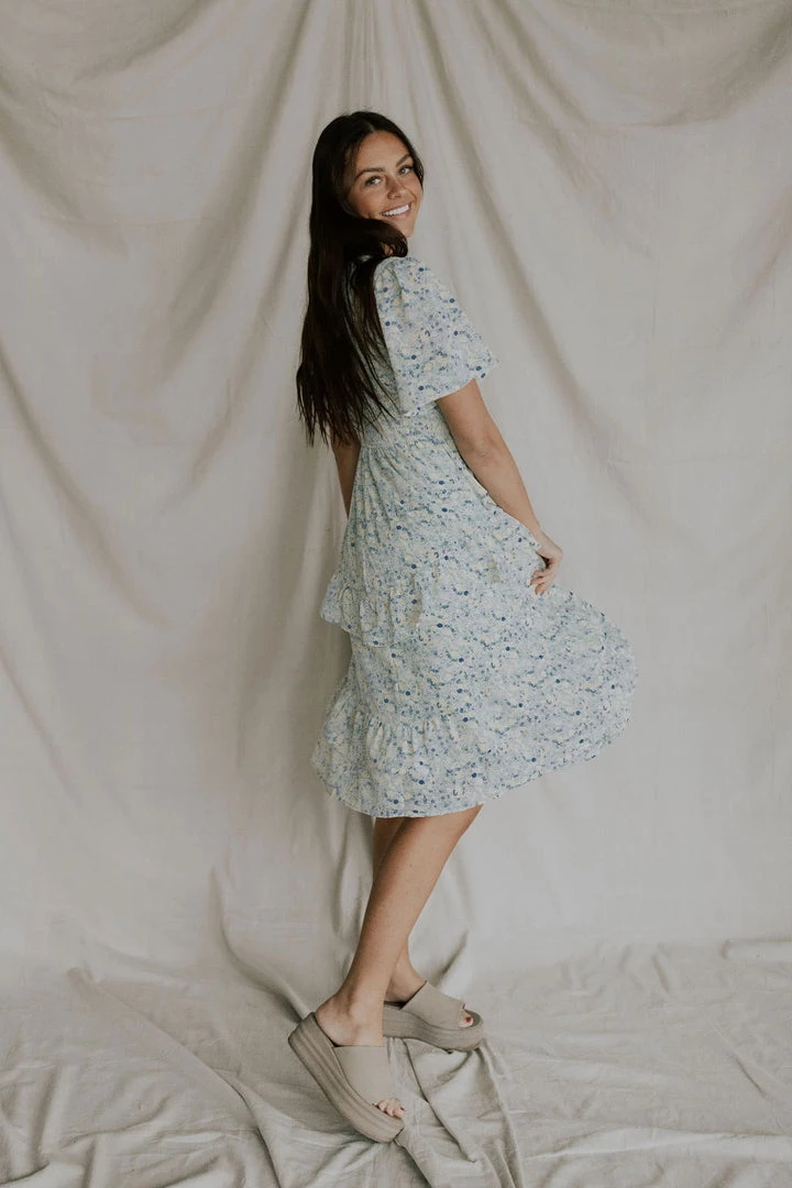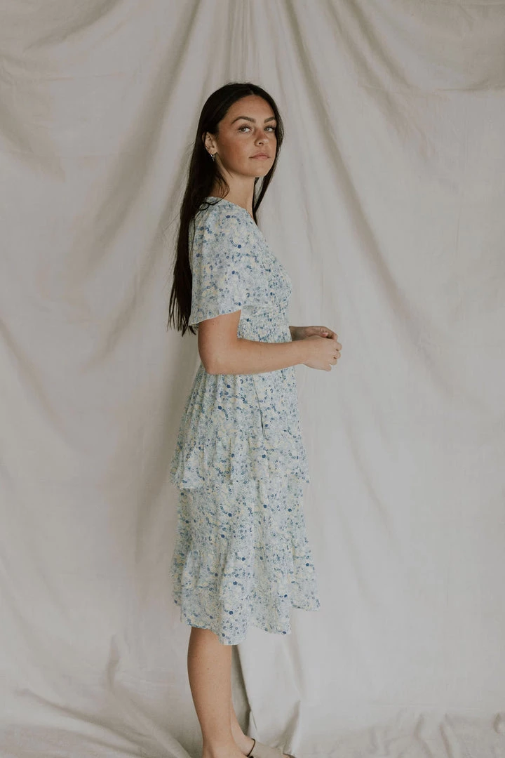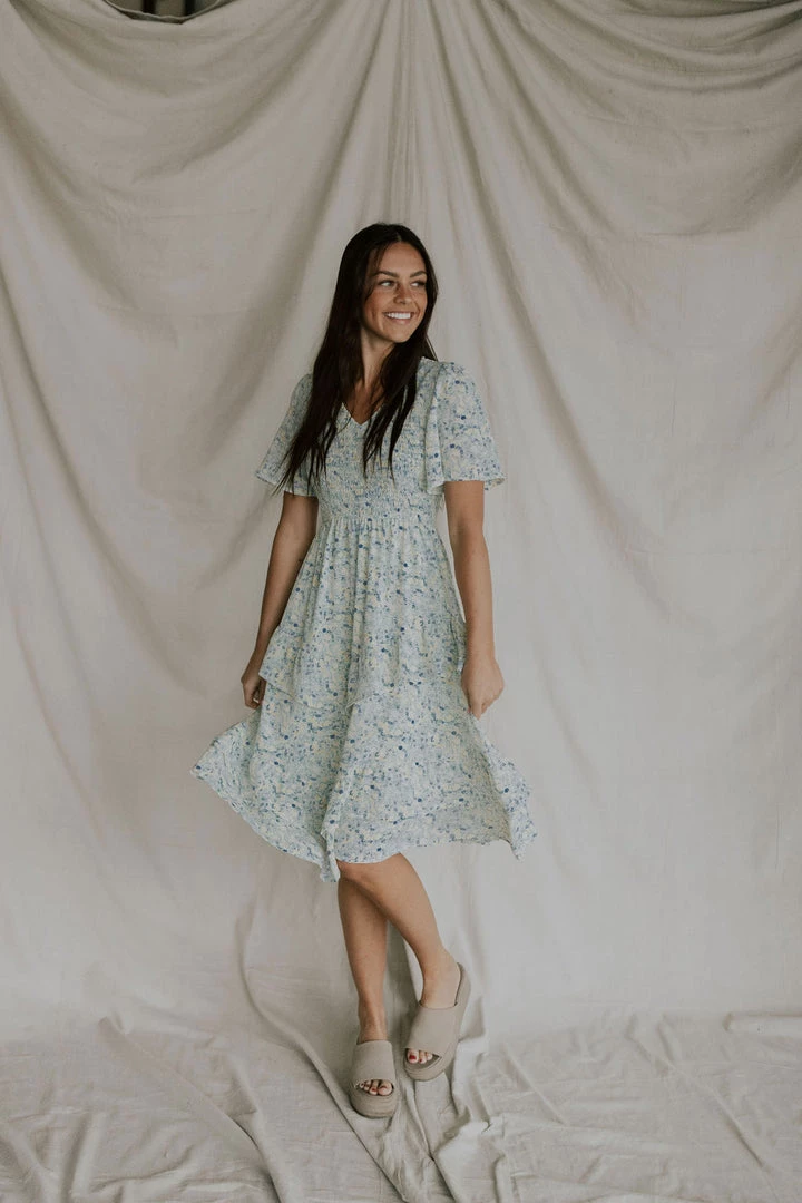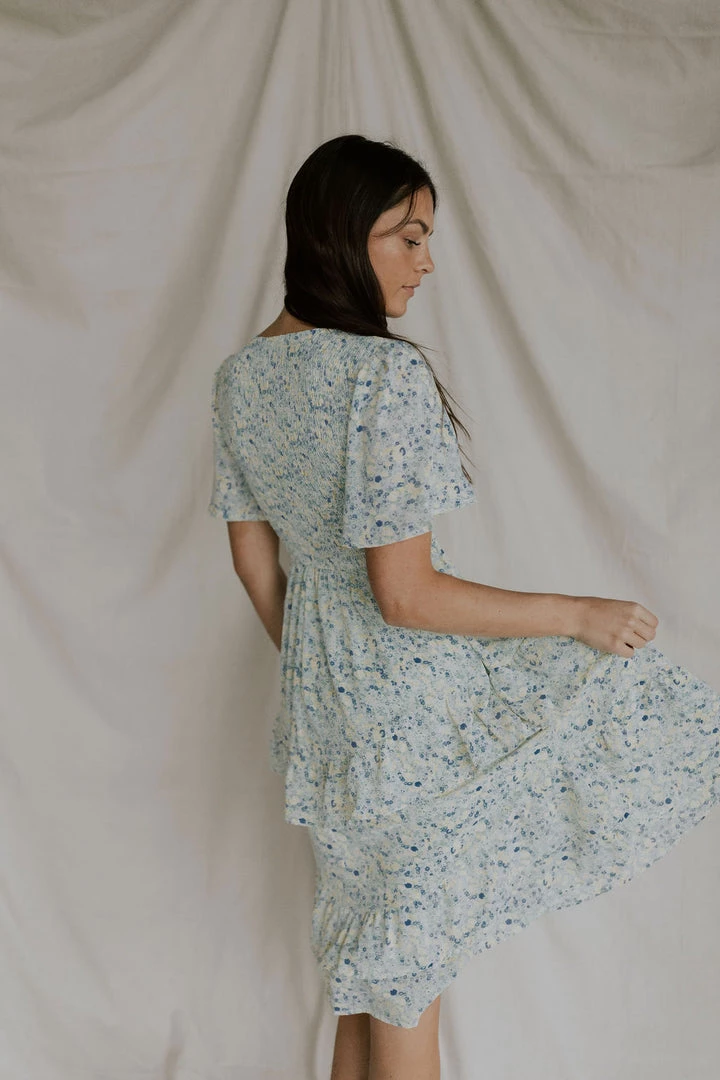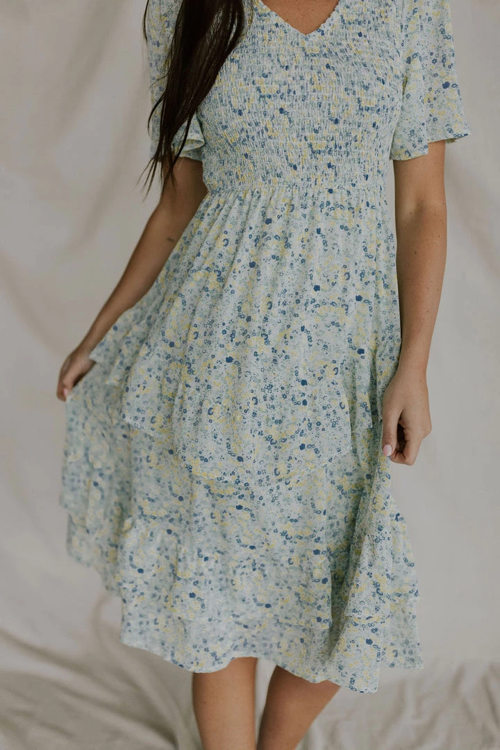 V-necked smocked top dress with floral print. Tiered ruffle skirt. Skirt lined.