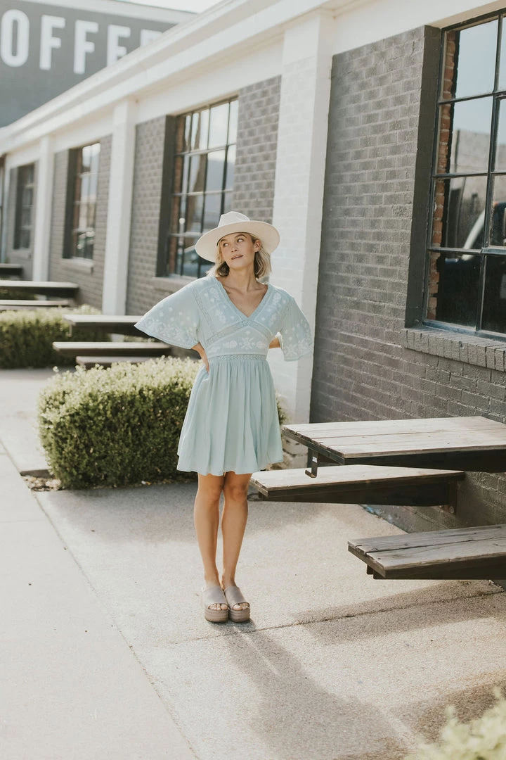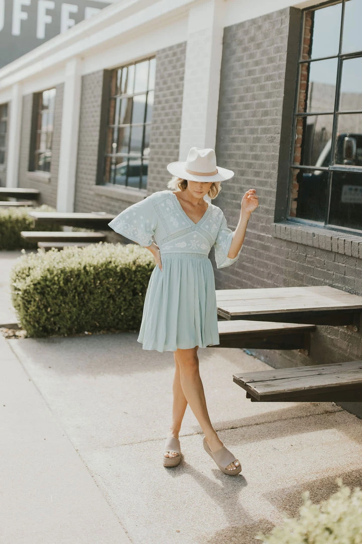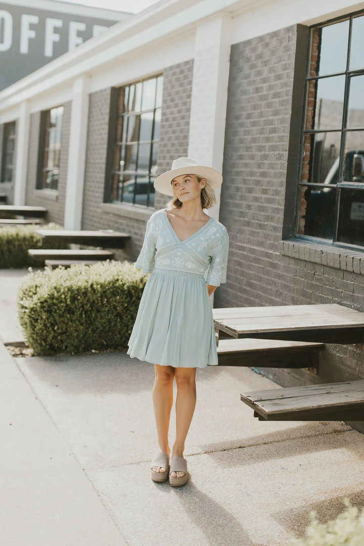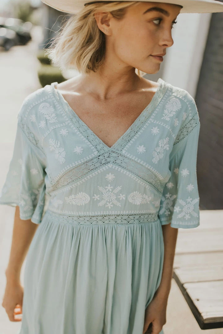 Light sage midi dress with cream embroidery. Skirt lined. Side zipper and elastic waistband across back. Â