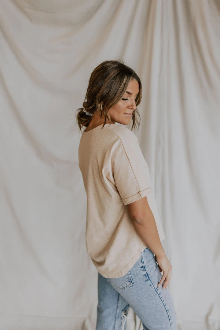 V-neck tee. Wood button front. Cuffed sleeves. Scooped hem. Lots of stretch. Nursing friendly. Available in multiple colors.