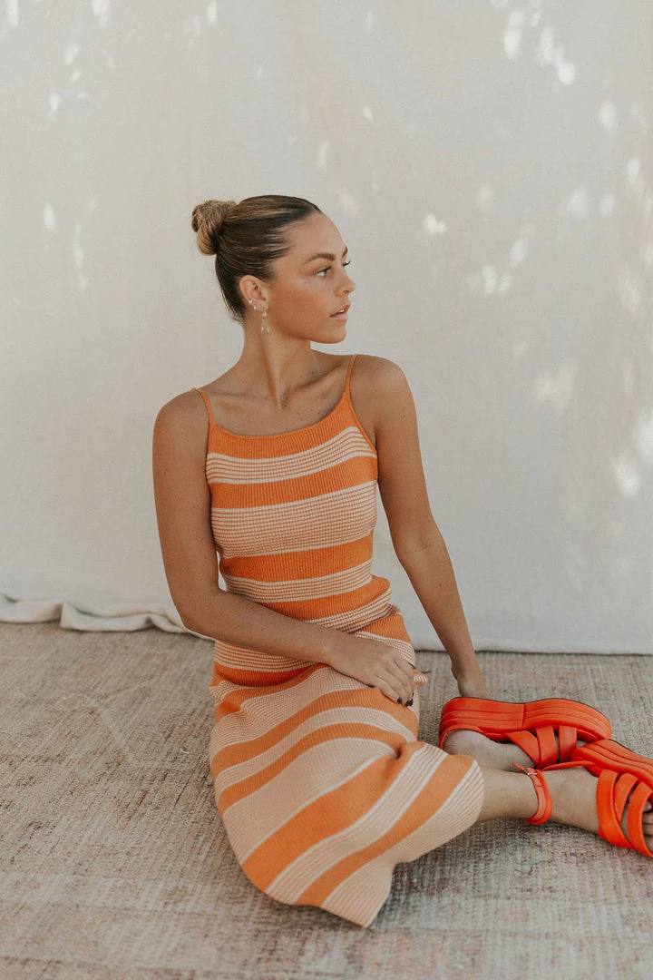 Stripe ribbed sweater dress in marmalade. Adjustable straps. Criss cross detail on back. Soft ribbed fabric with lots of stretch. Nursing friendly!