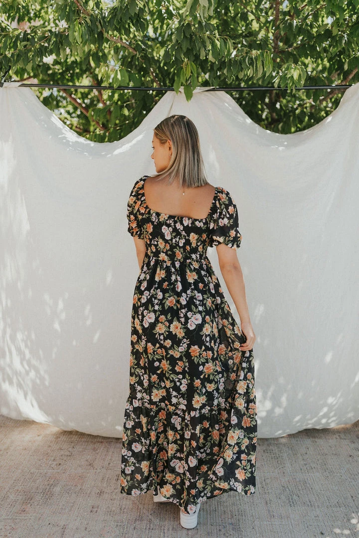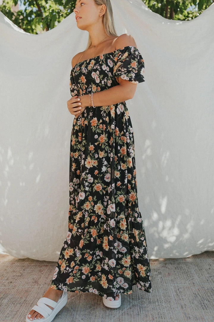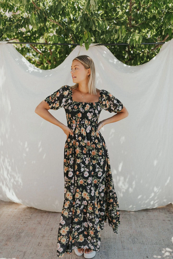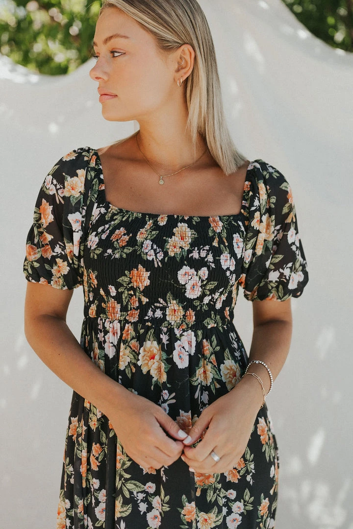 Floral maxi. Smocked bust. Square neckline with elastic shoulders can be worn on or off the shoulder. Puff sleeves. Sheer fabric with lining in body down to knee. Nursing friendly!