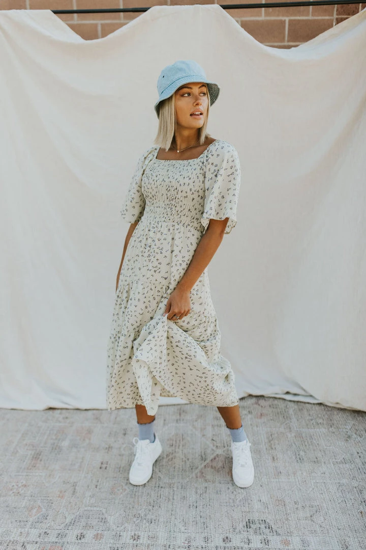 Model is size 4 & 5’10” wearing Small. Paired with the Denim Bucket Hat, Morgan Ruffle Socks in Lavender.