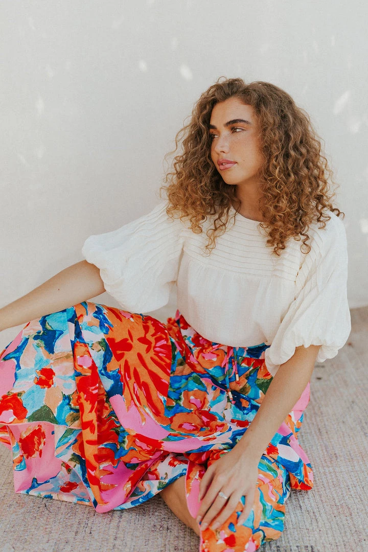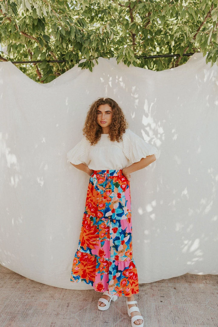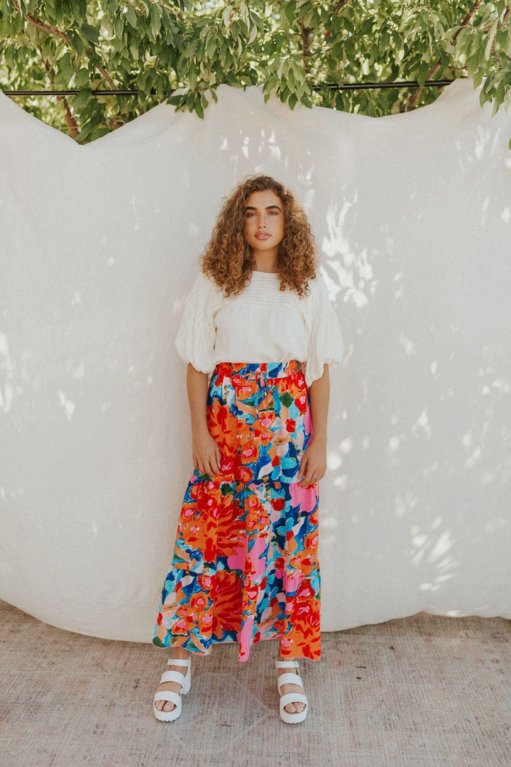 Tropical floral maxi skirt. Elastic waist with tie and brass tie details. Tiered skirt.