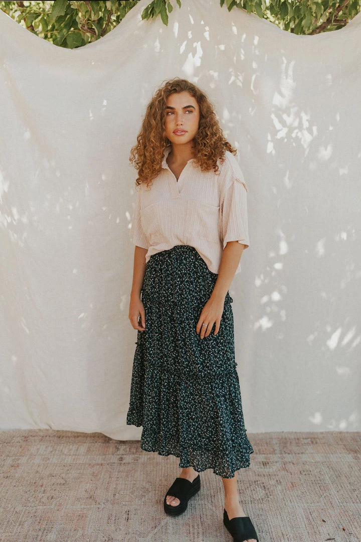 Floral midi skirt. Tiered skirt with ruffle detail. Skirt lined. Elastic waistband