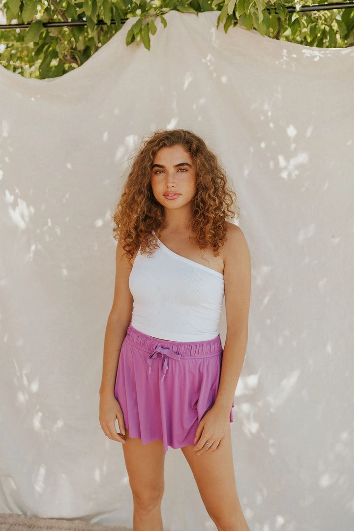 Go from the court to the dance studio in this functional skort featured in a lightweight fabrication and flowy fit with an adjustable drawstring, built-in shorts, and side-slit details.