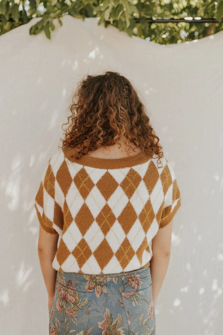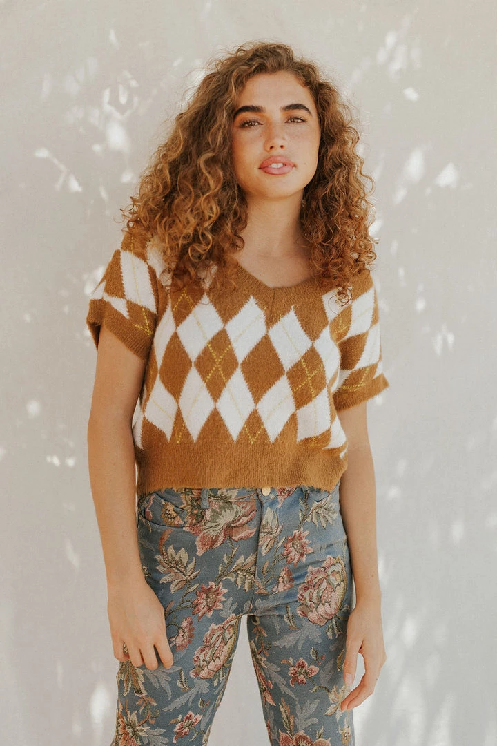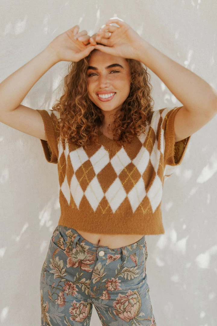 So cool and classic in a timeless checkered design, this essential sweater vest is featured in a staple V-neck, cropped silhouette for added versatility. MSRP $78