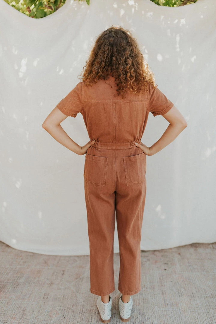 Utility jumpsuit in clay. Chest, side and back pockets. Elastic sides. Button up. Sturdy soft colored denim. Nursing friendly