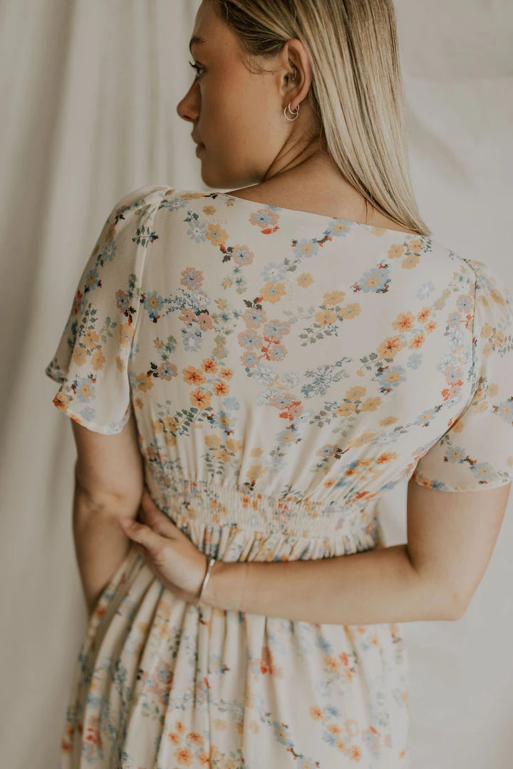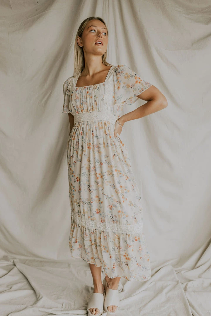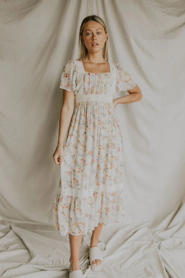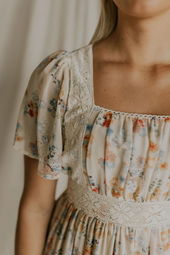 Square neck midi with lace trim. Dress fully lined. Size zipper. Floral print with lace ruffle skirt details.