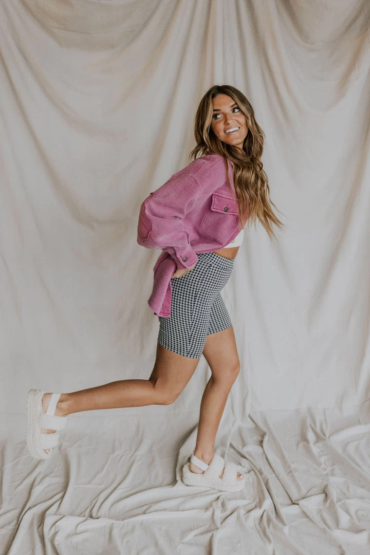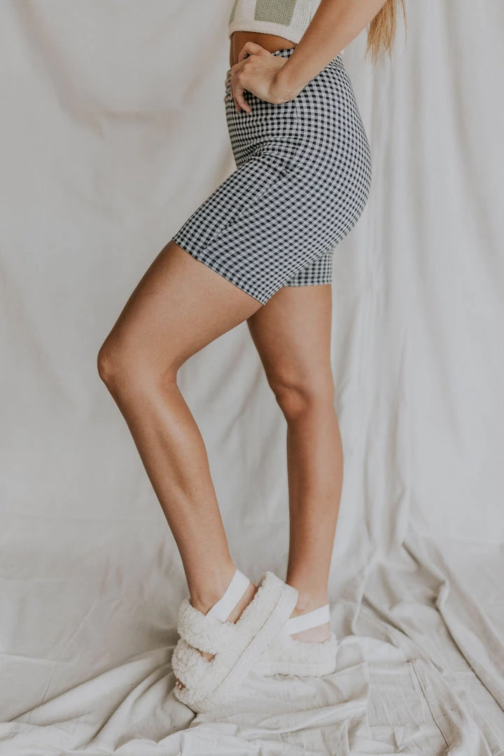Biker short in black and white gingham. Super soft with lots of stretch.