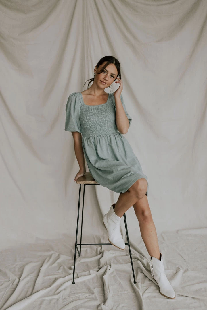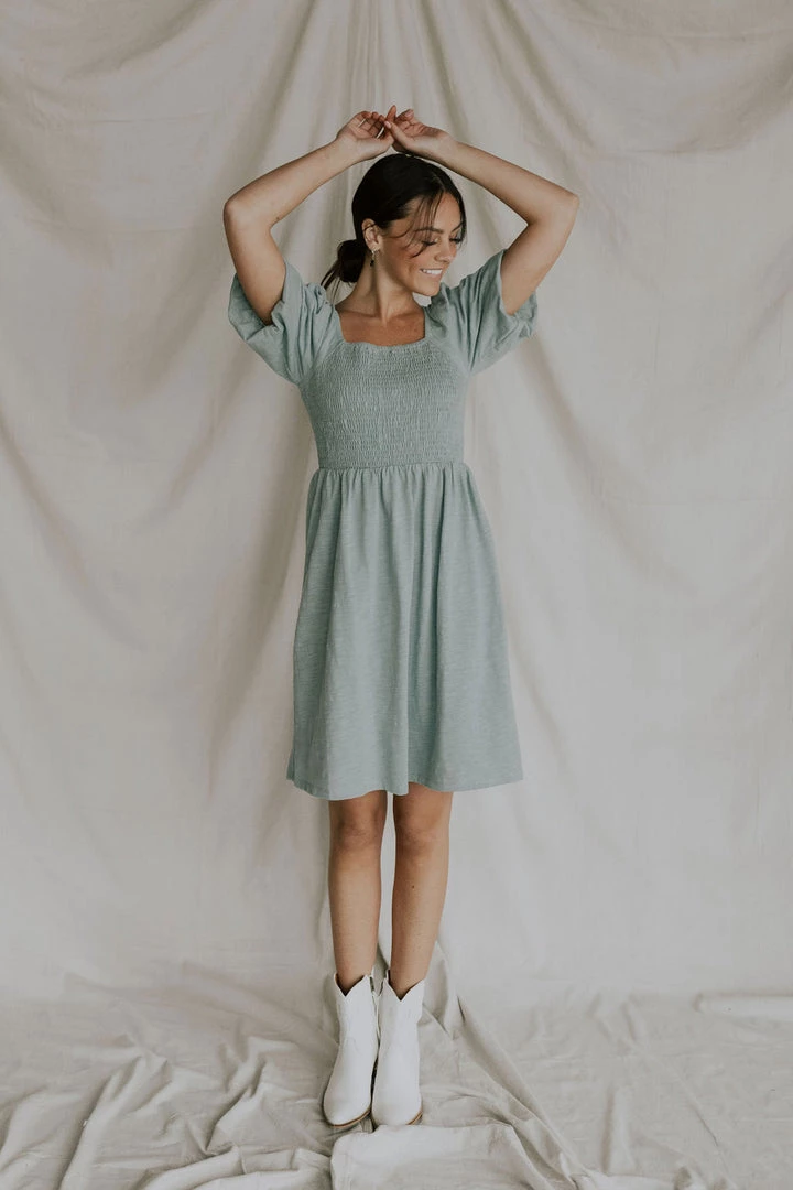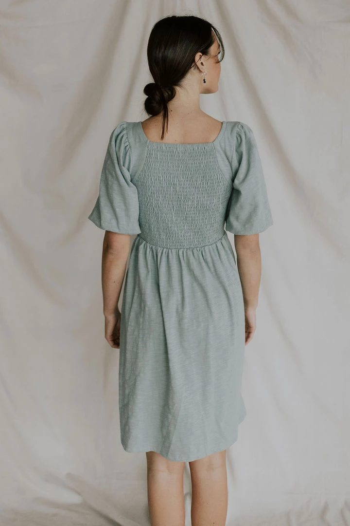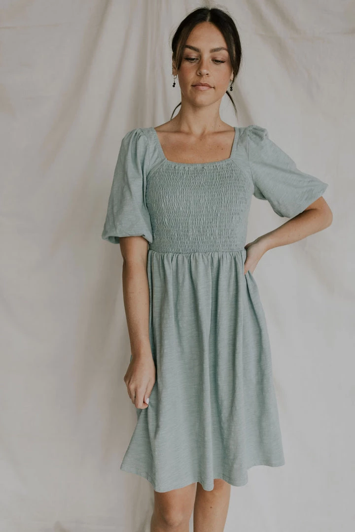 Smocked babydoll midi. Square neck with puff sleeves. Elastic waistband. Skirt lined. Â