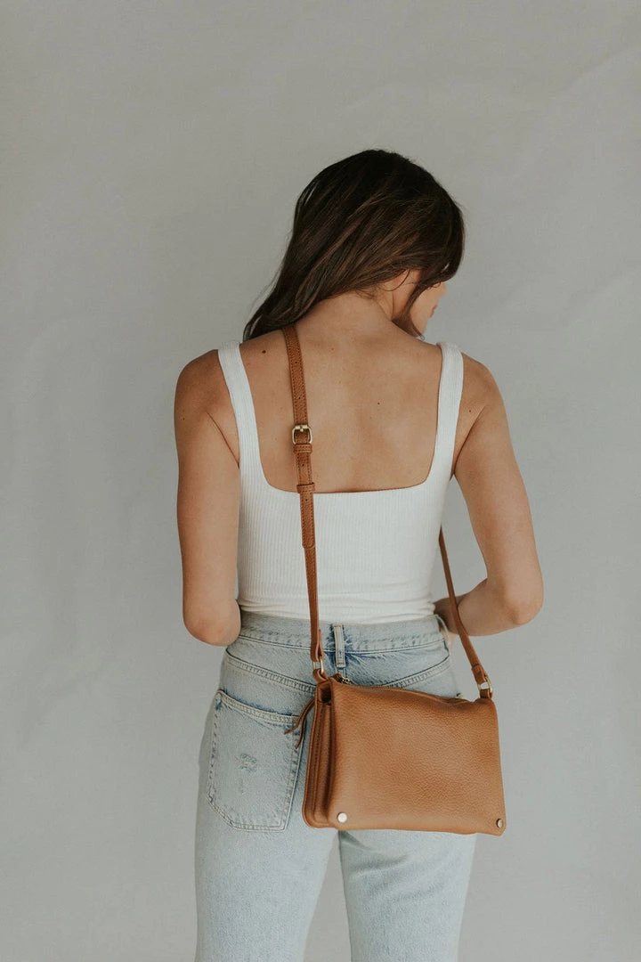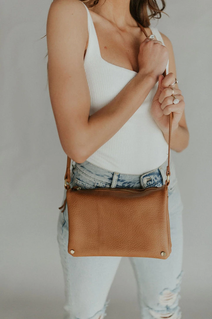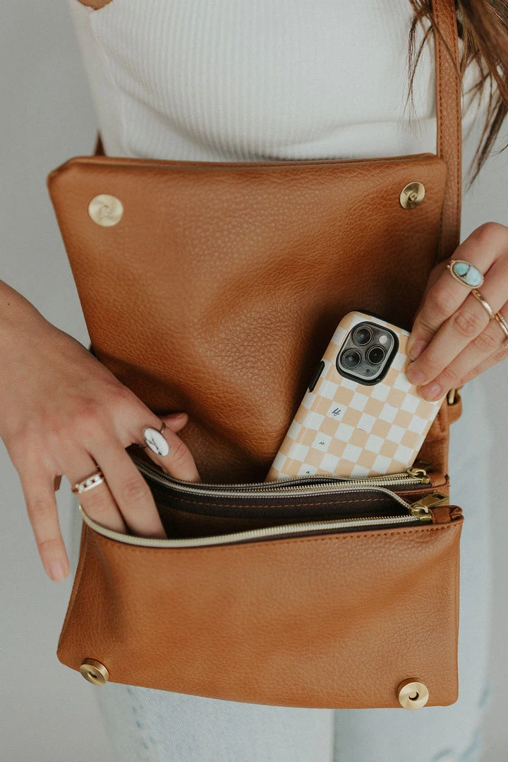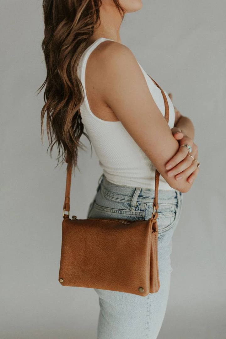 Front snap flap crossbody purse. Top zipper pocket. Under flap has two zipper pockets and two open pockets.