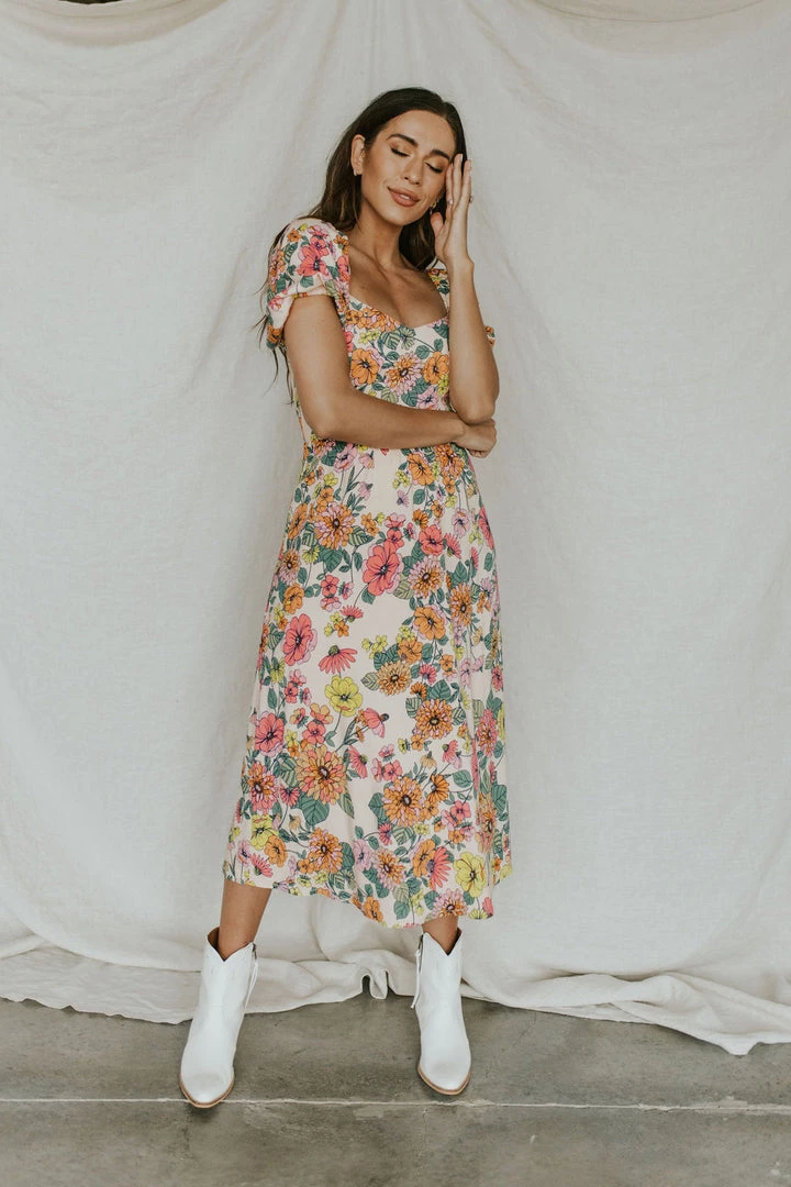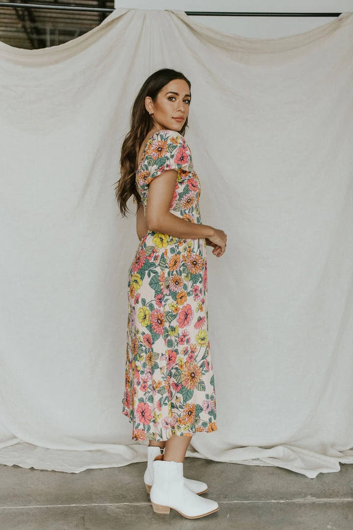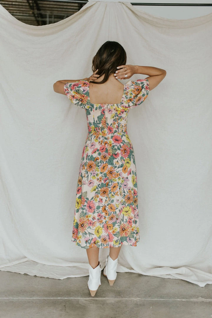 Linen look fabric with soft feel. Wide neckline with v neck detail. Elastic shoulders can be worn on or off the shoulder. Zipper back with smocked panel for added fit. Dress lined.