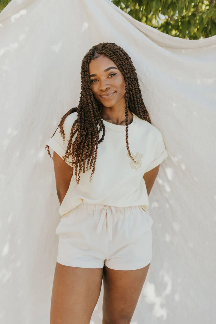 Linen paper bag shorts in natural. Elastic waistband with tie at waist. Side pockets.
