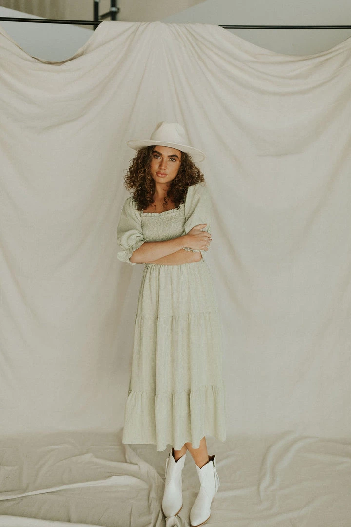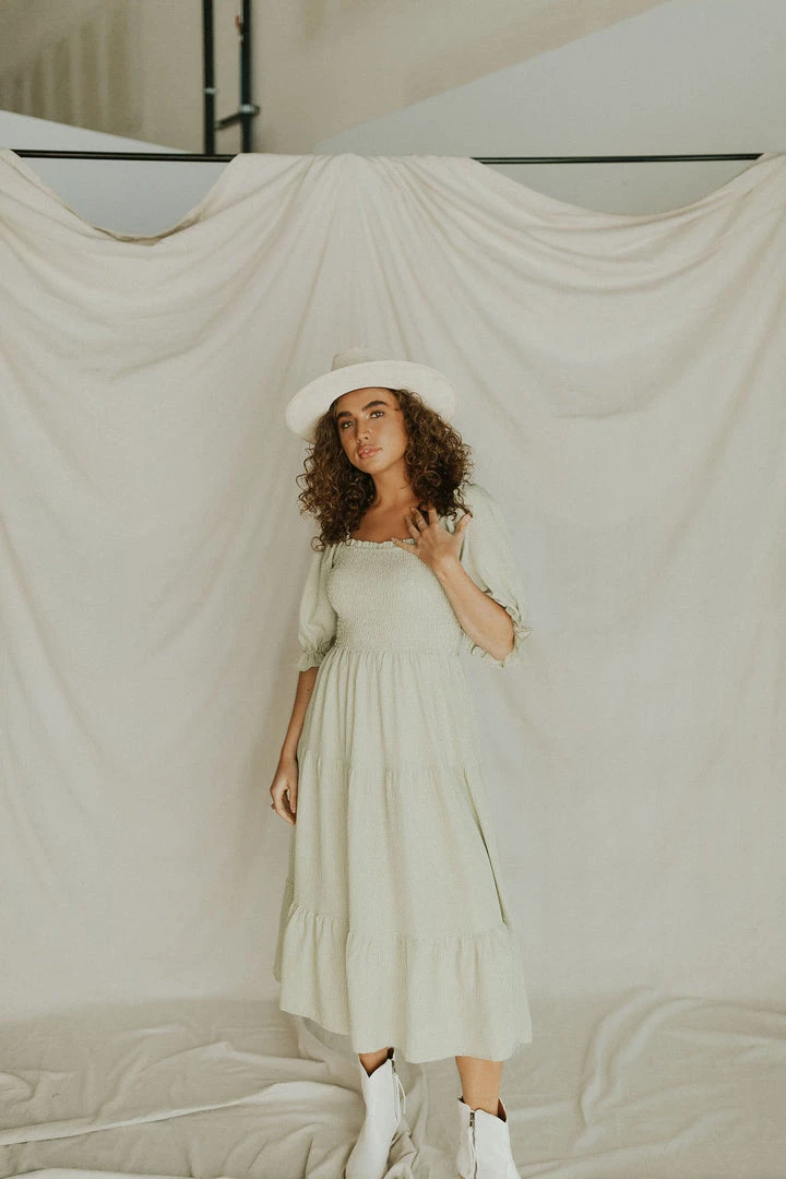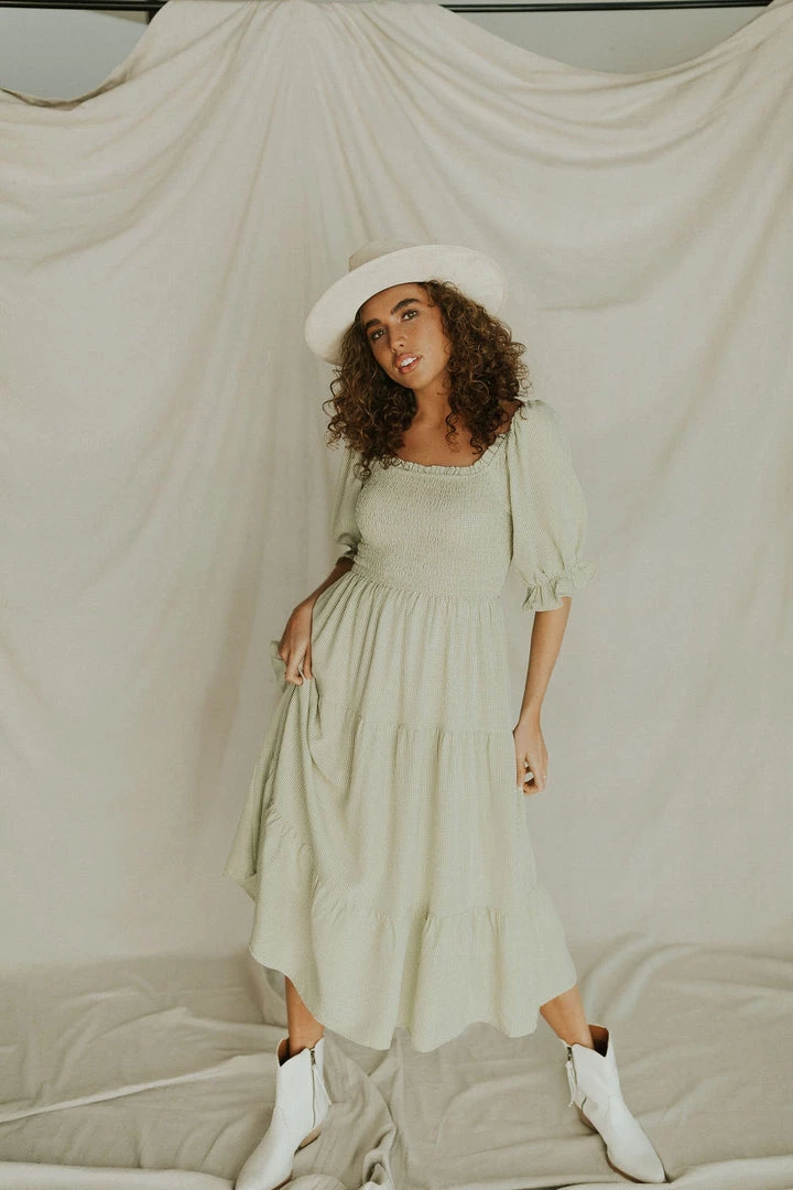 Square neck gingham midi. Elastic sleeves can be worn on or off the shoulder. Puff sleeves with ruffle detail. Side pockets. Tiered skirt with lining. Tie in back. Available in multiple colors. Nursing friendly!