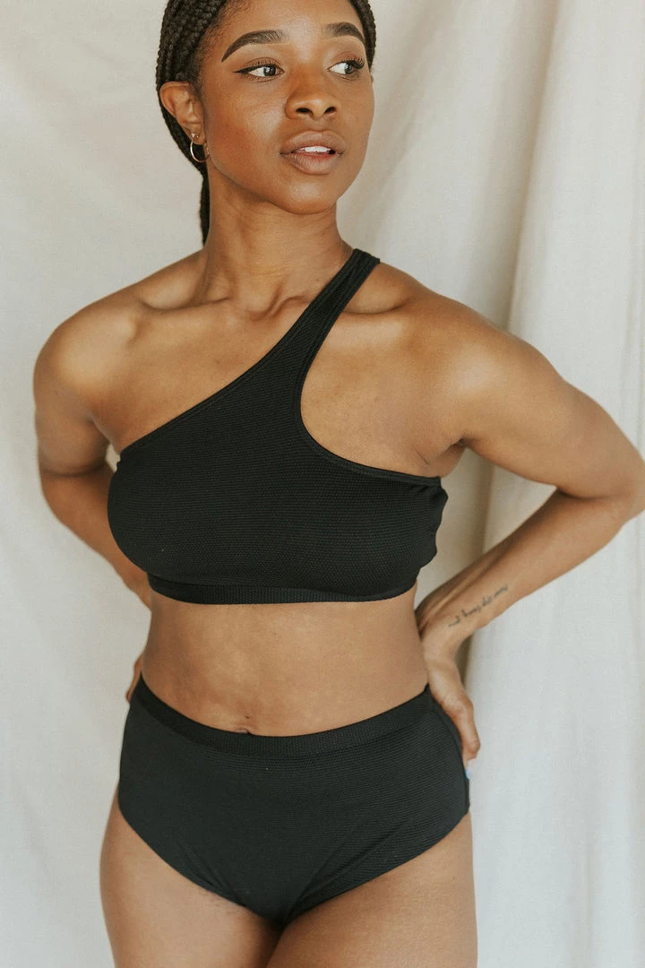 Textured black high waisted swim bottom.  Lined with soft black Luxe lining.
