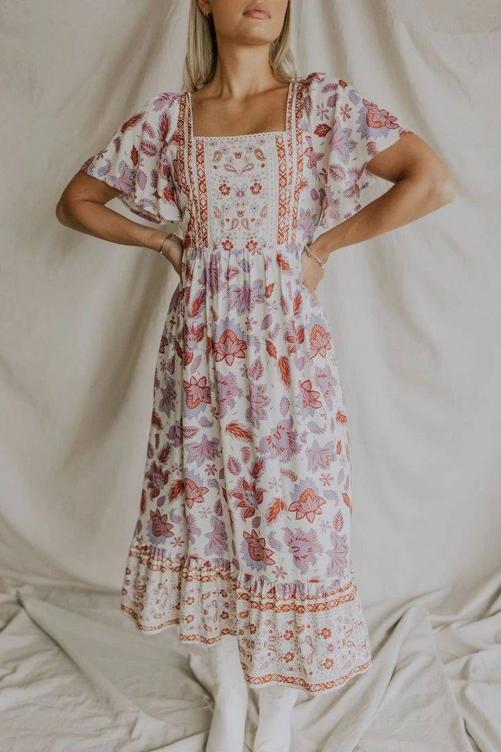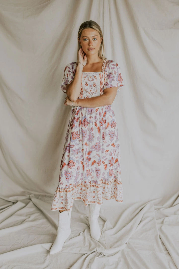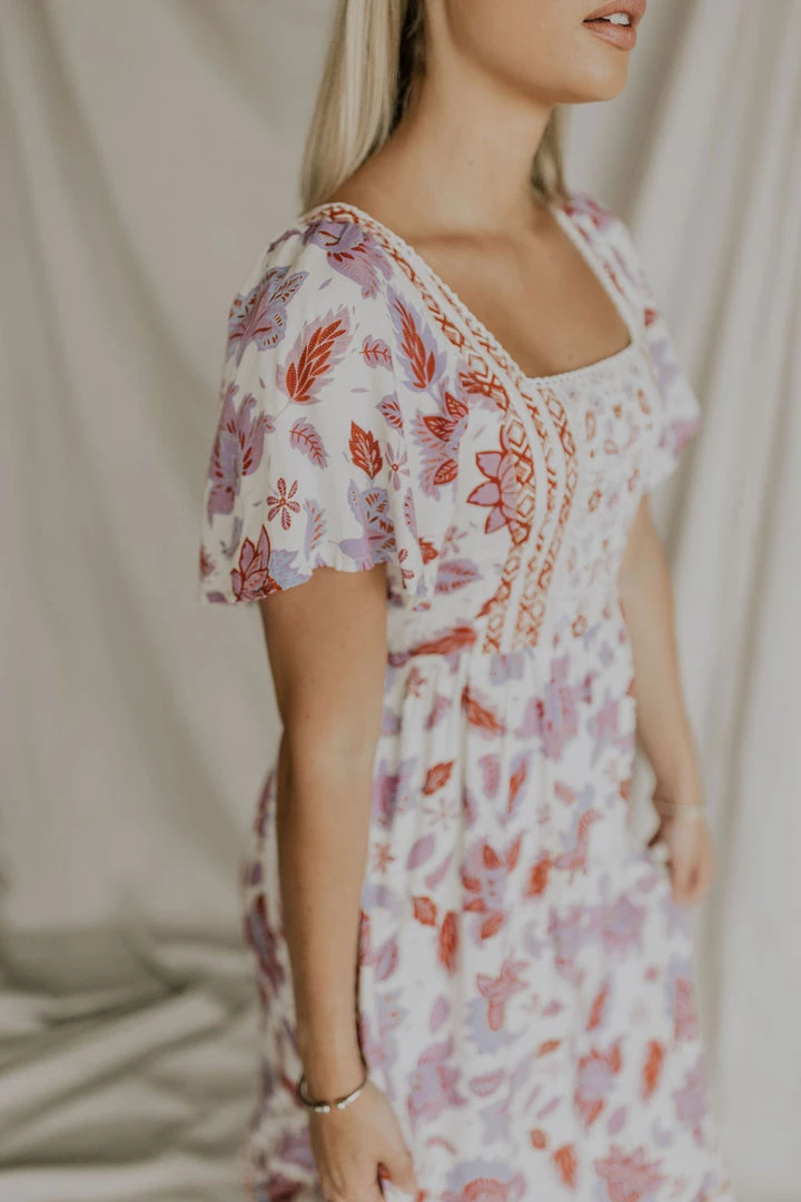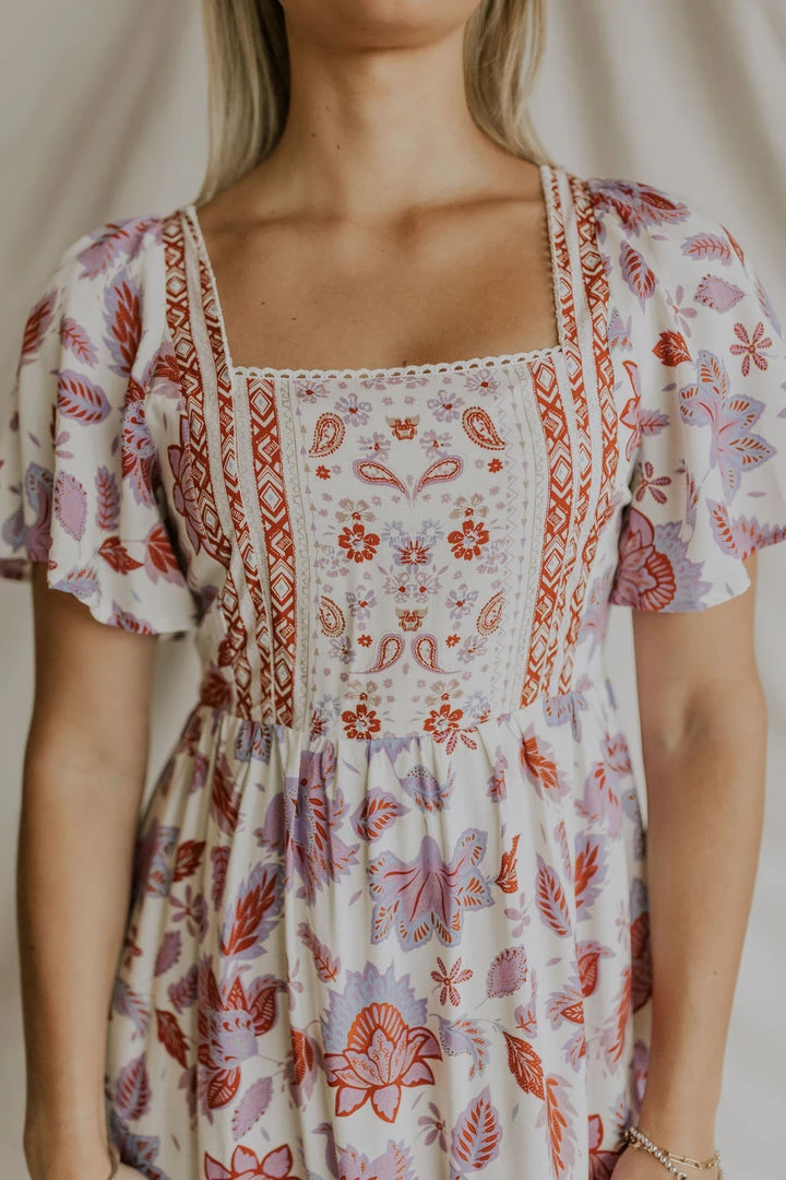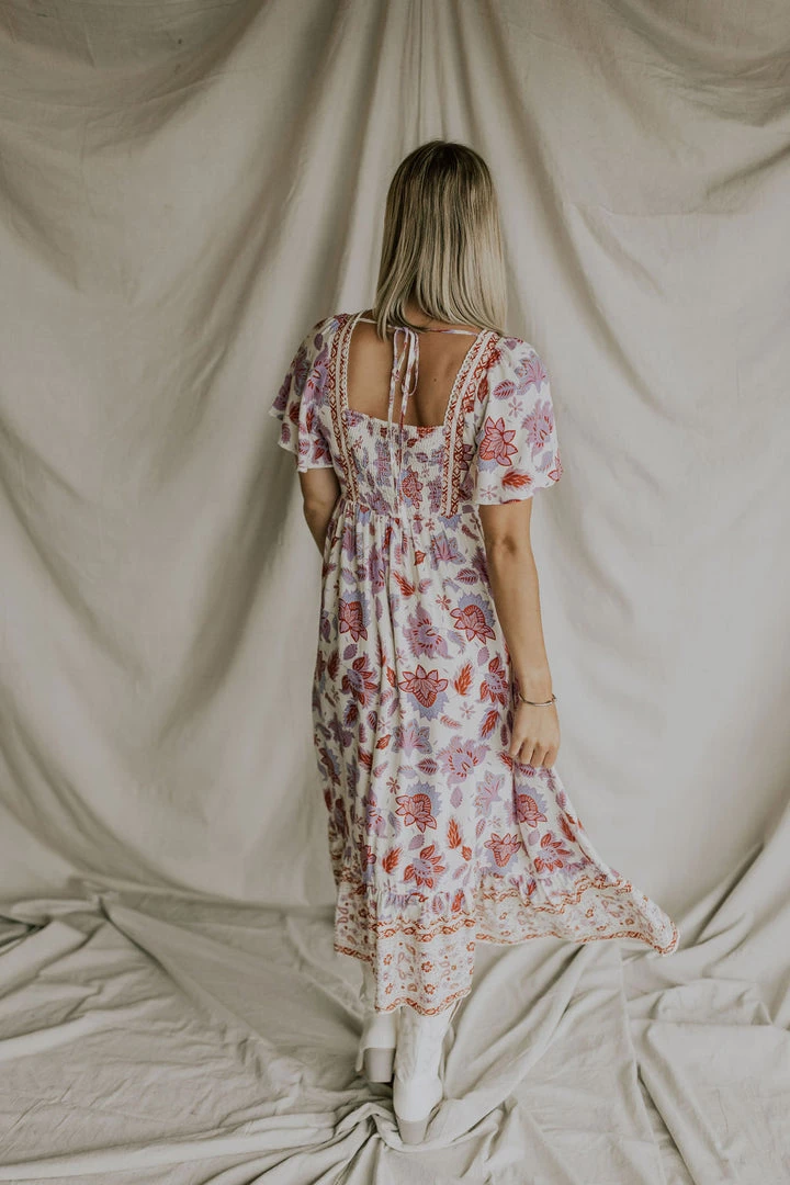 Square neck midi with lace trim. Floral print. Tie in back. Size zipper. Skirt lined. Bell sleeves. Smocked panel across back. Available in multiple colors.