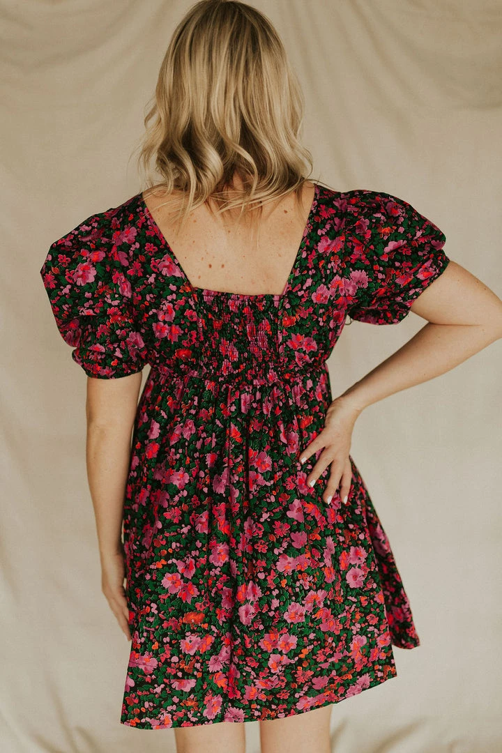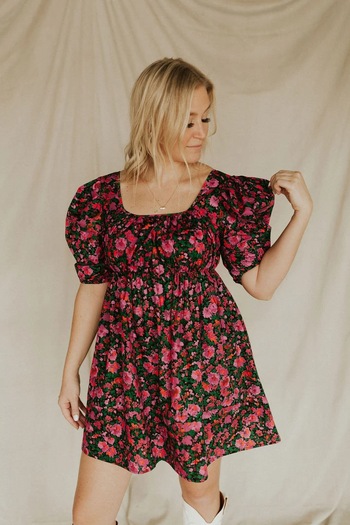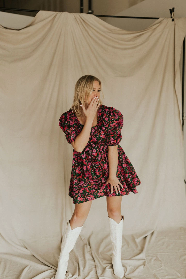 Floral mini dress in black. Puff sleeves. Square neck with pleated front. Skirt has pleated detail on hem.
