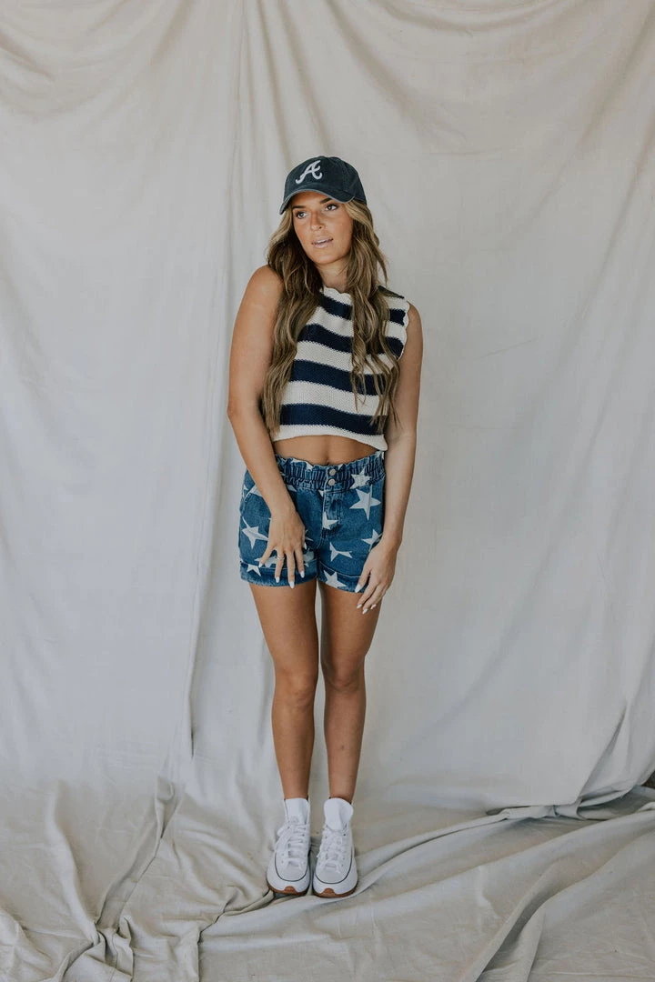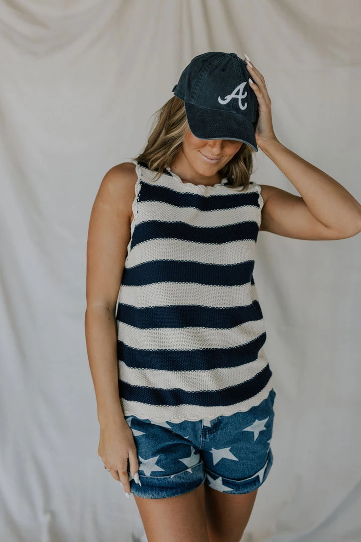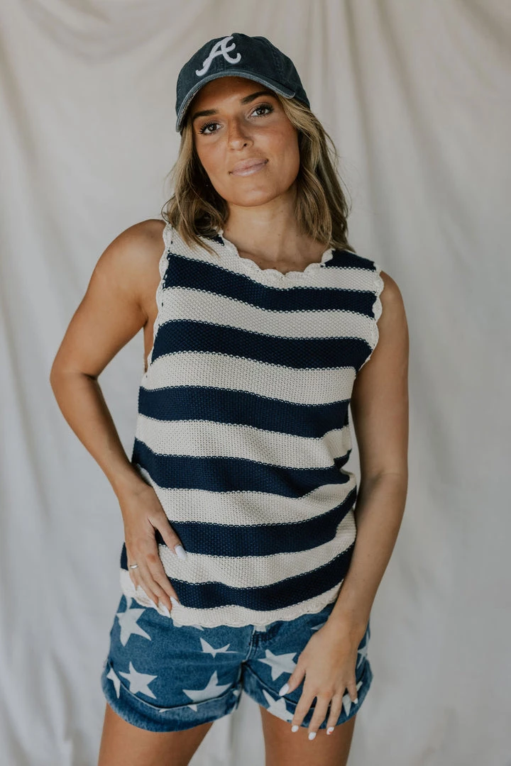 Scalloped hem sweater vest. Horizontal stripes. Soft with lots of stretch. Available in multiple colors. Â