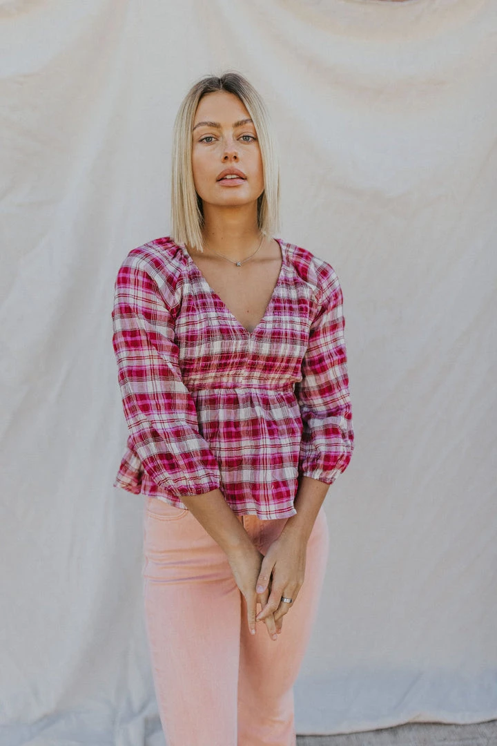 Low V smocked top in fuchsia & red plaid. Crinkle fabric. Long sleeves with ruffle peplum. Â