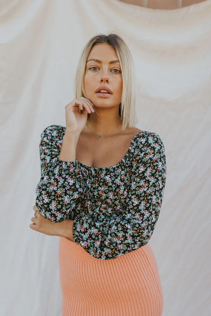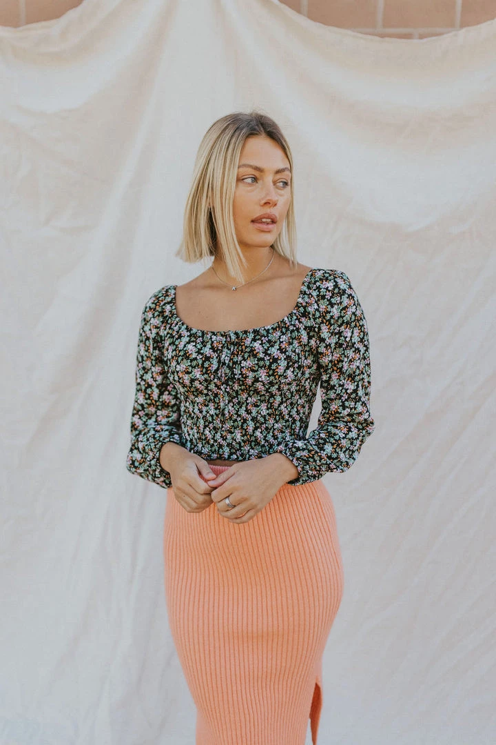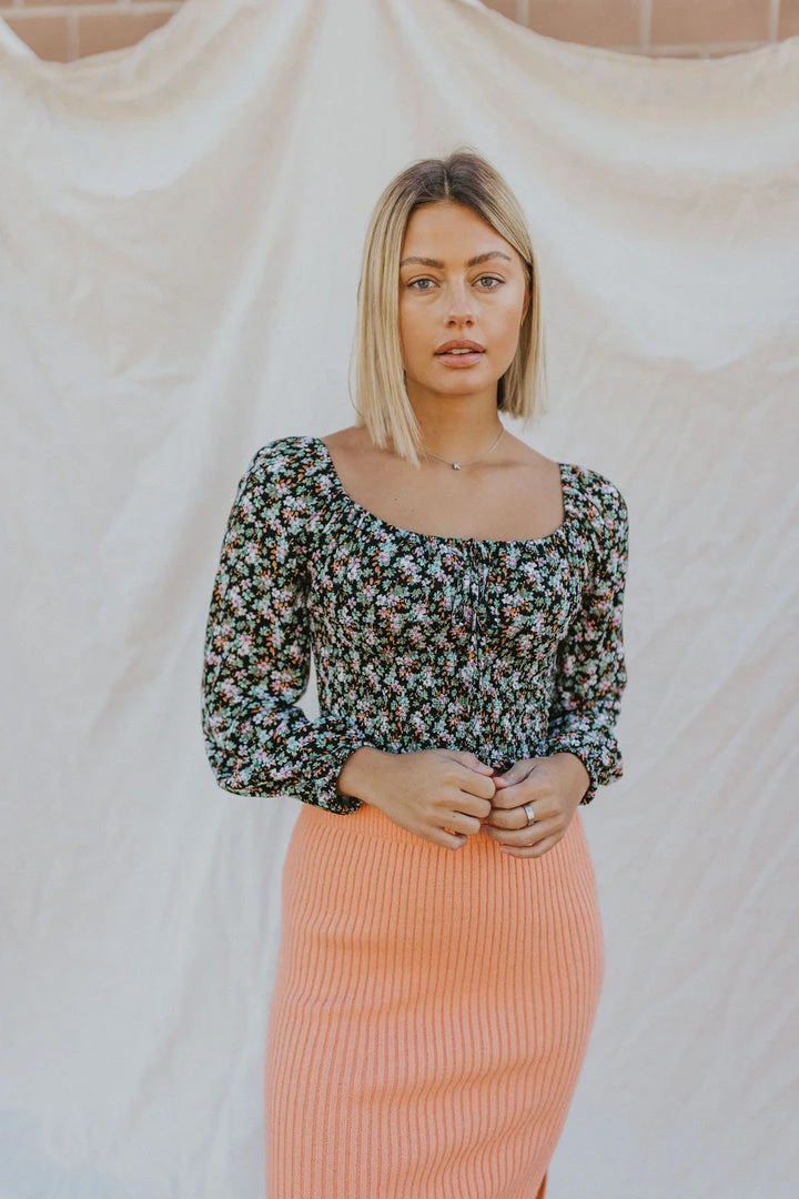 Long sleeve crop blouse with elastic neck. Tie in front. Nursing friendly!! Can be worn on or off the shoulders. Smocked chest with lots of stretch. Square neckline in back. Available in multiple colorsÂ