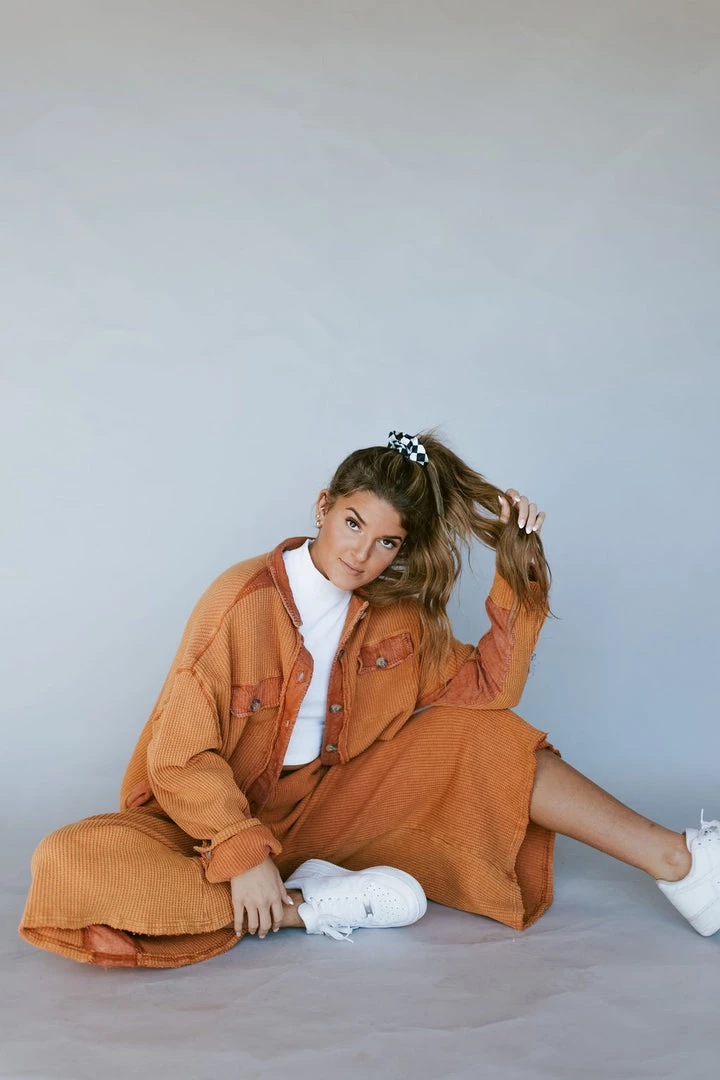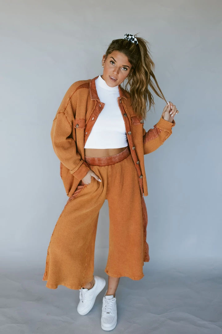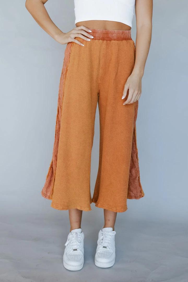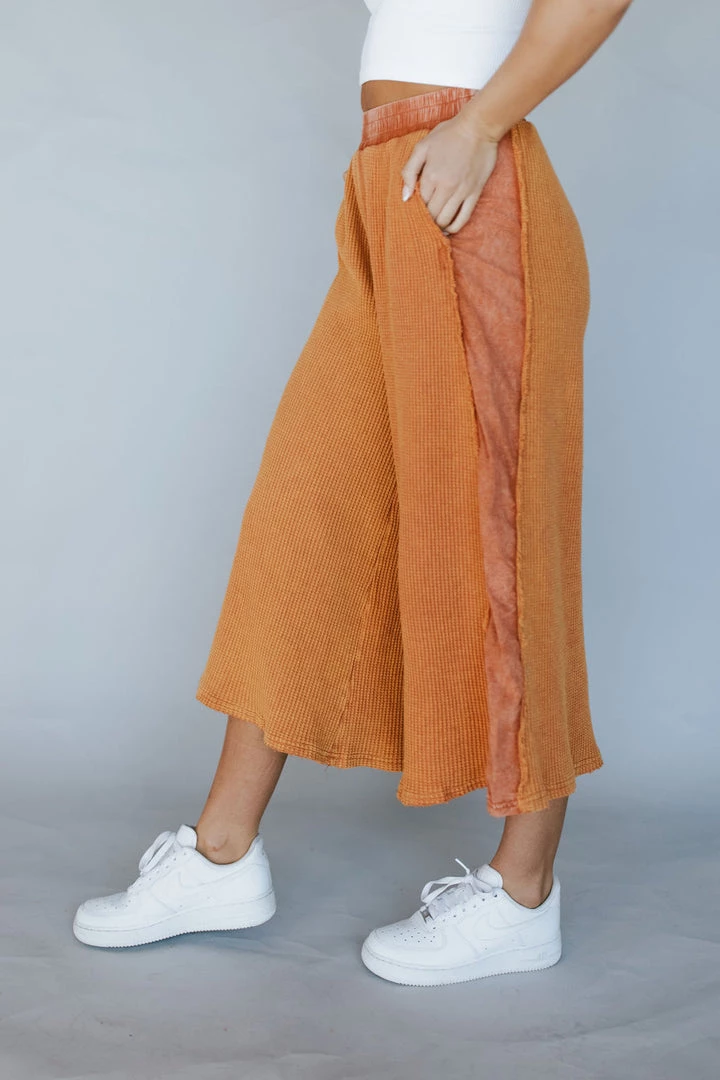 Waffle fabric with contrasting side panels. Flared wide leg cropped pants. Elastic waist with side pockets. Pair perfectly with the Layer Up Thermal Shacket in Caramel.