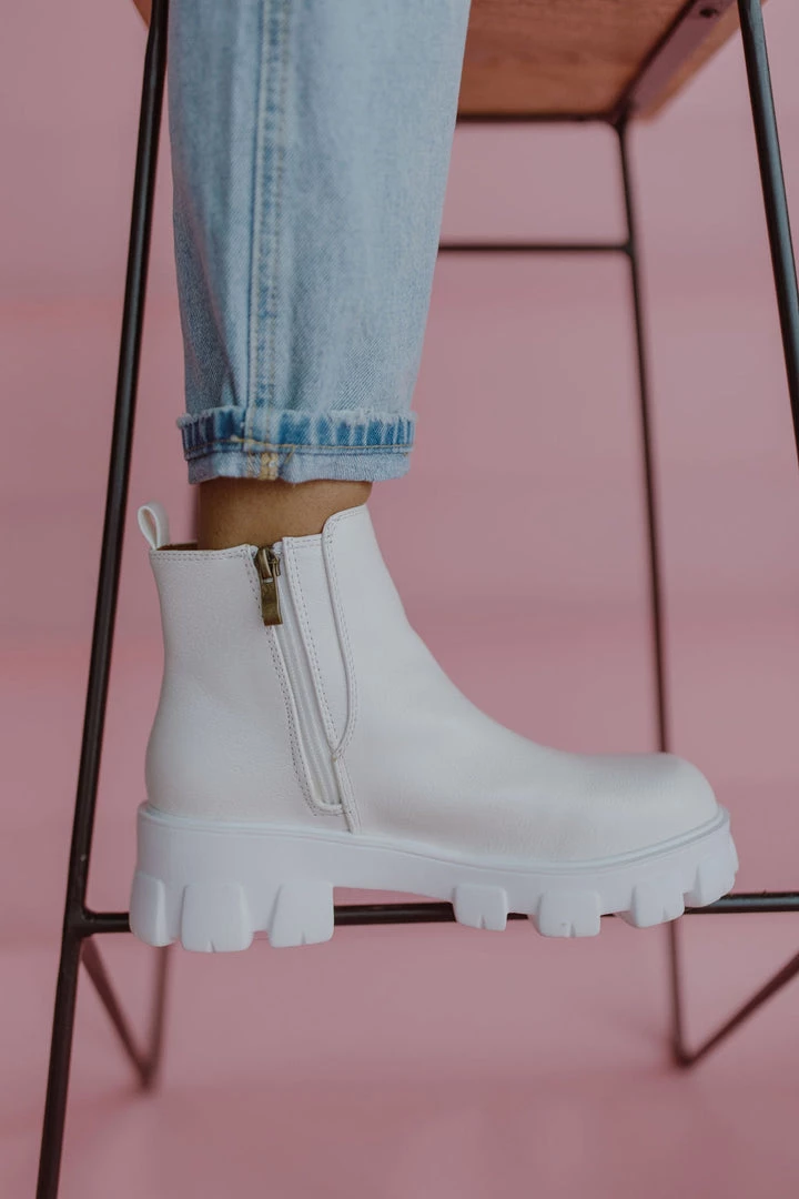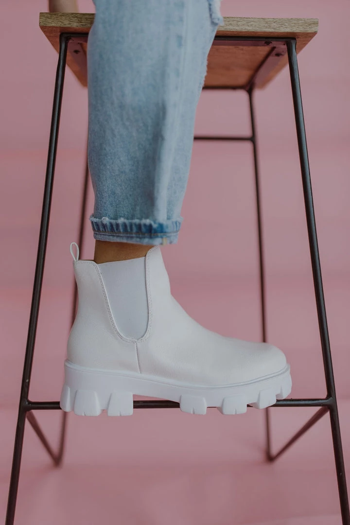 Chelsea boot in white. Elastic side and inside zipper for easy in and out. Chunky sole.