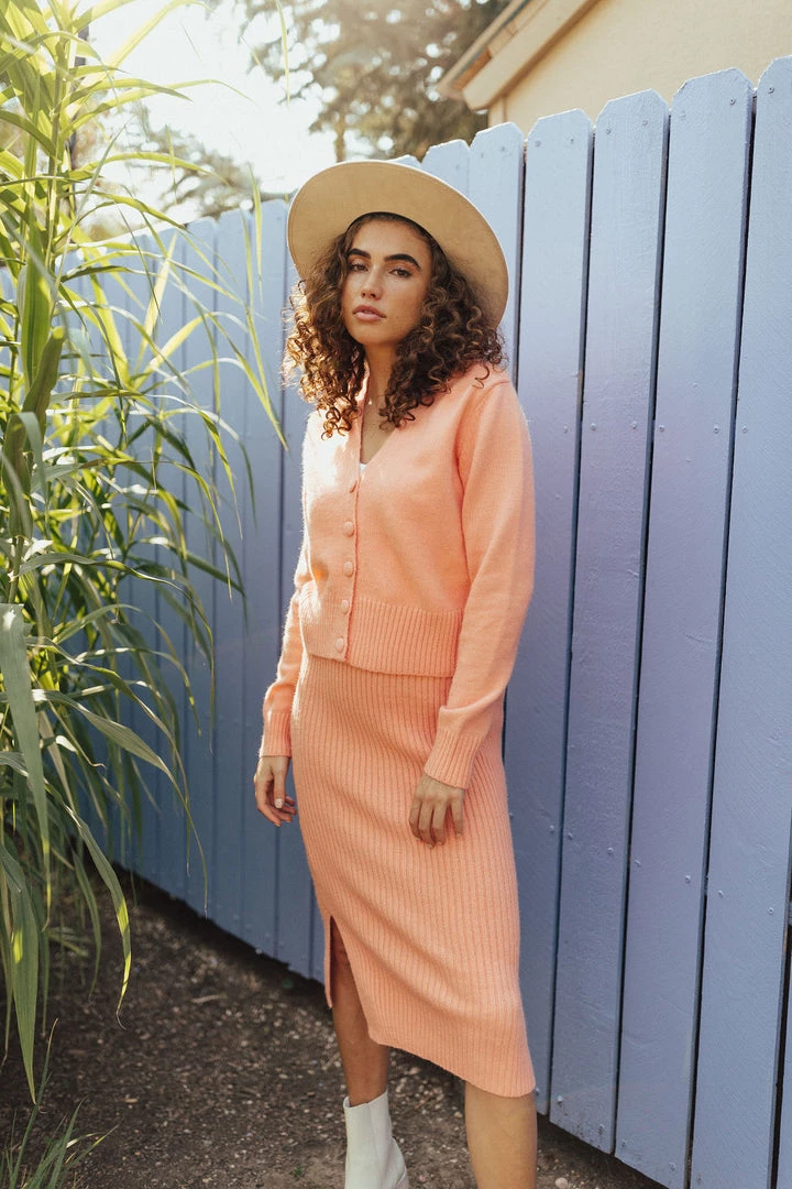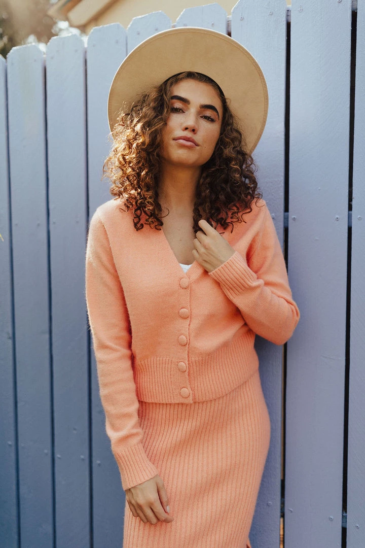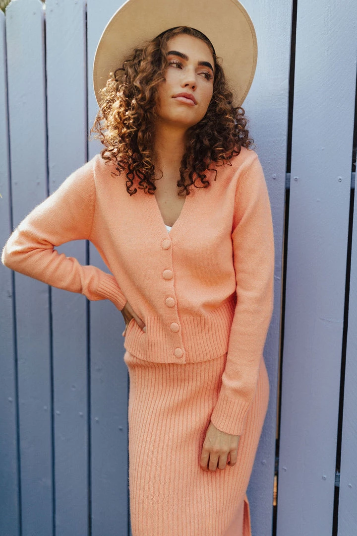 Soft knit sweater in coral. V-neck with covered button detail. Pair perfectly with the Misha Sweater Skirt