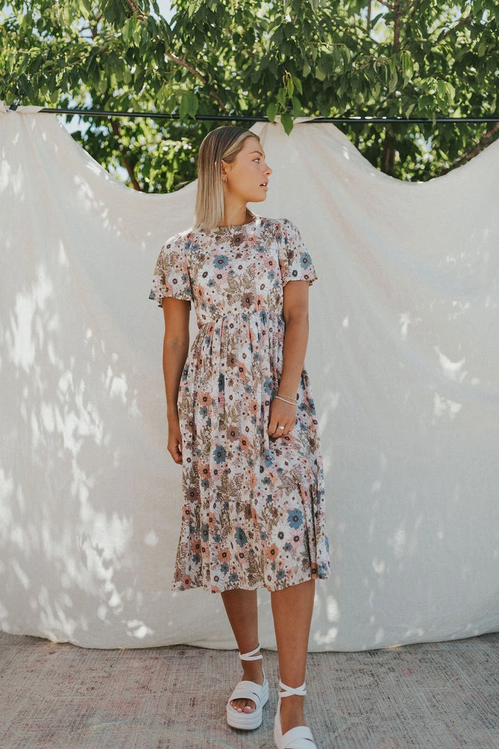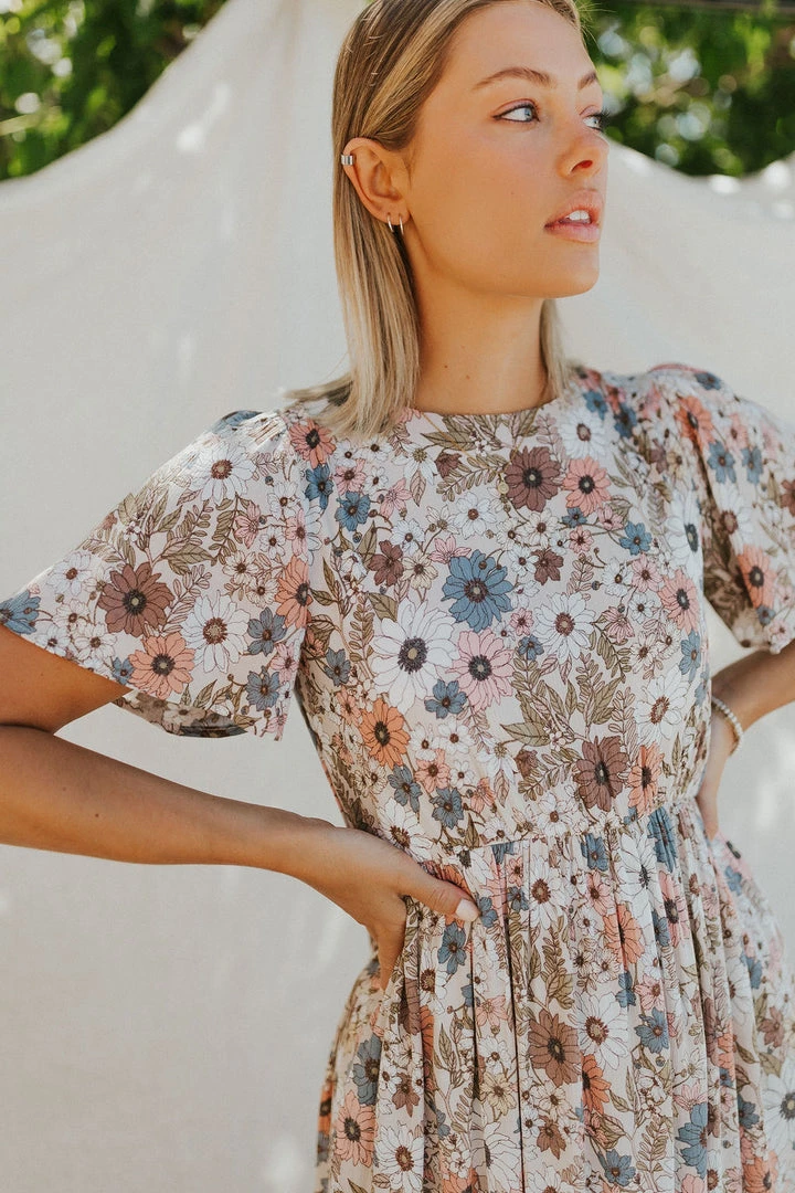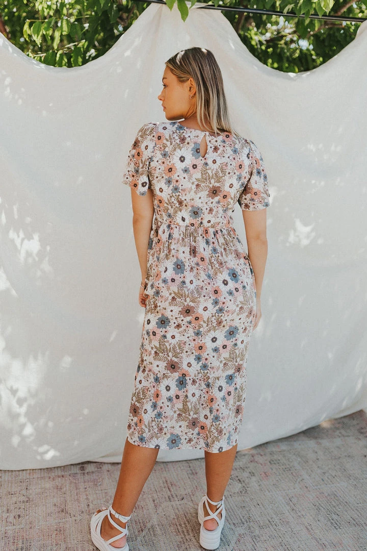 Floral midi in neutral tones. Dress lined. Elastic waist with side pockets. Single button closure in back.