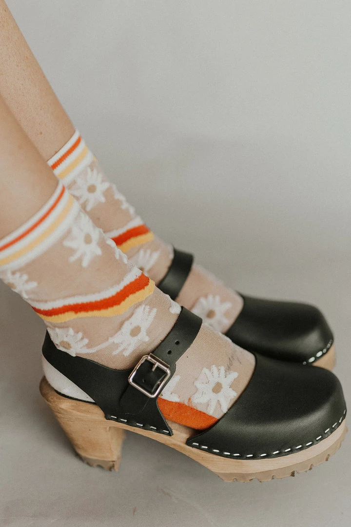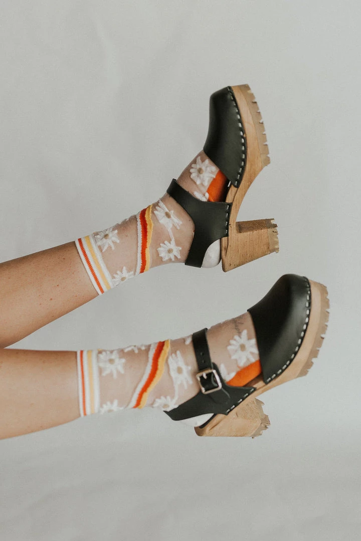 Leather clogs handmade in Sweden from the finest Swedish alder-wood + Italian leather. Closed-toe with adjustable ankle strap and high platform. Non-skid soles.