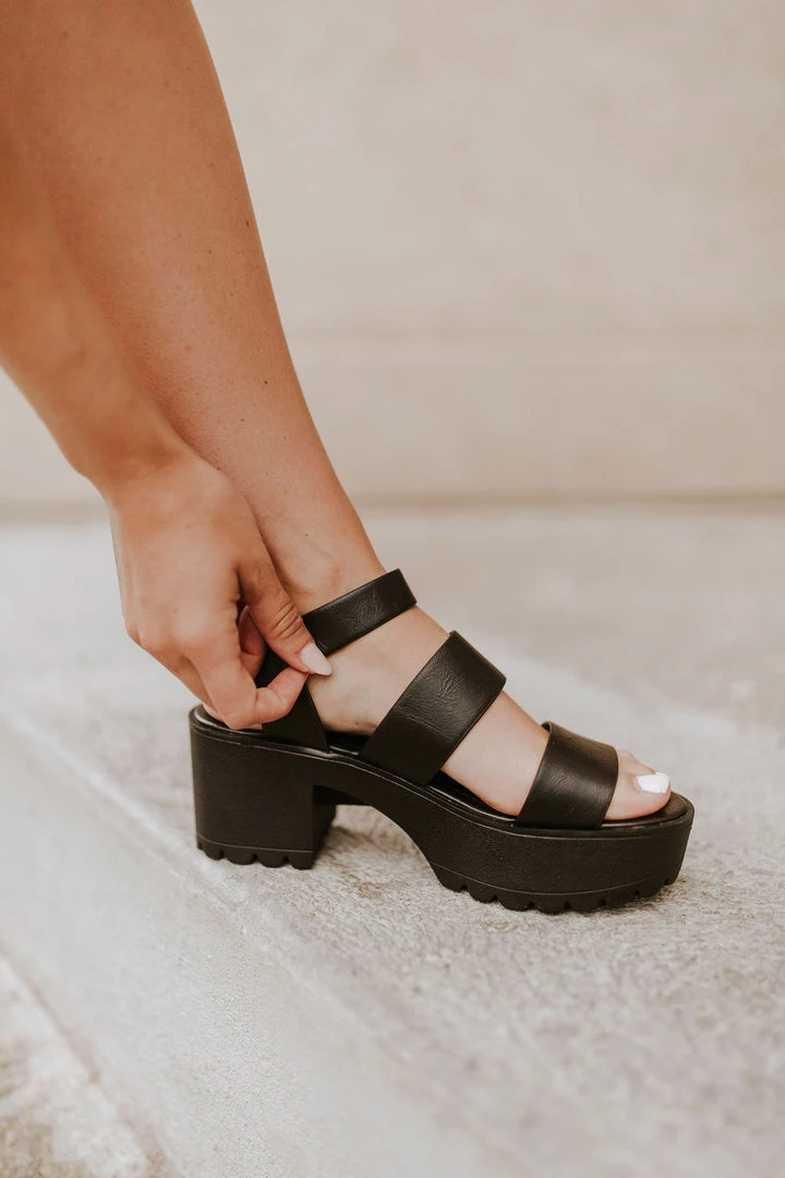 Double strap sandal with buckle on ankle. Chunky lightweight 3″ heel. Available in white, taupe or black.