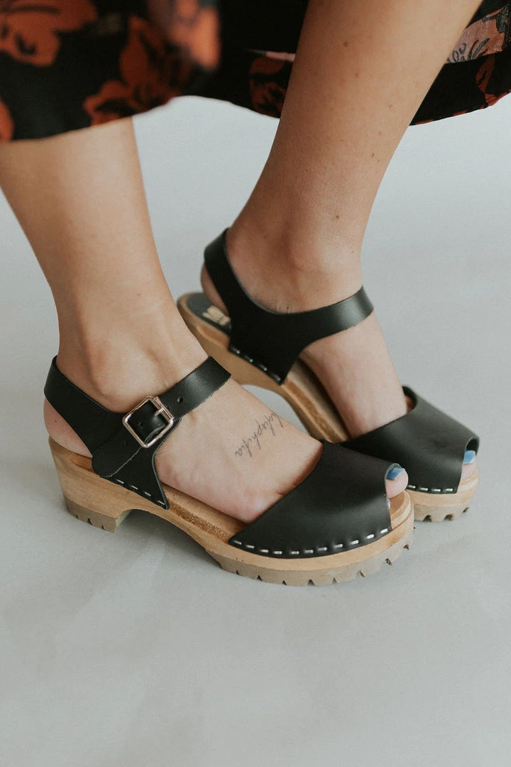 Leather clogs handmade in Sweden from the finest Swedish alder-wood + Italian leather. Peep-toe with adjustable ankle strap and low platform. Non-skid soles. Available in multiple colors