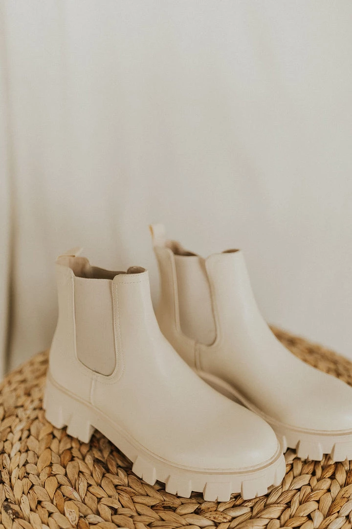 Chunky sole chelsea boot in cream. Elastic sides for easy on and off. 2″ heel.