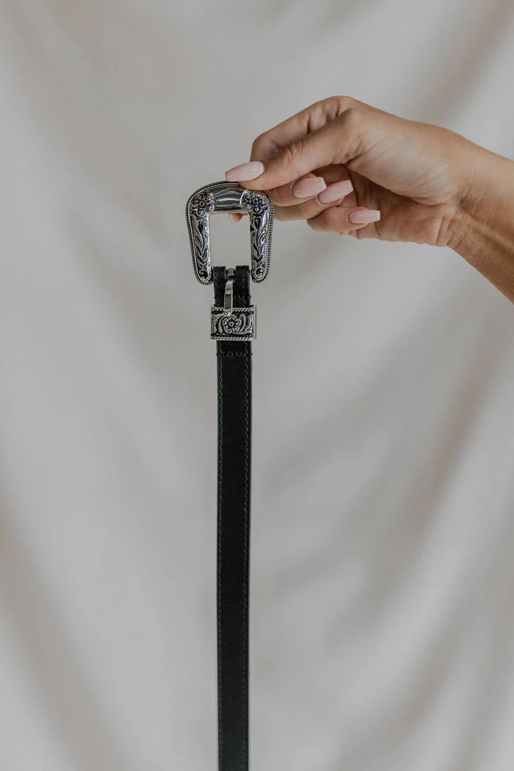 Genuine leather belt with shiny silver hardware. Engraved floral design on belt buckle, loop and tip. .75″ wide. Available in multiple colors.Â